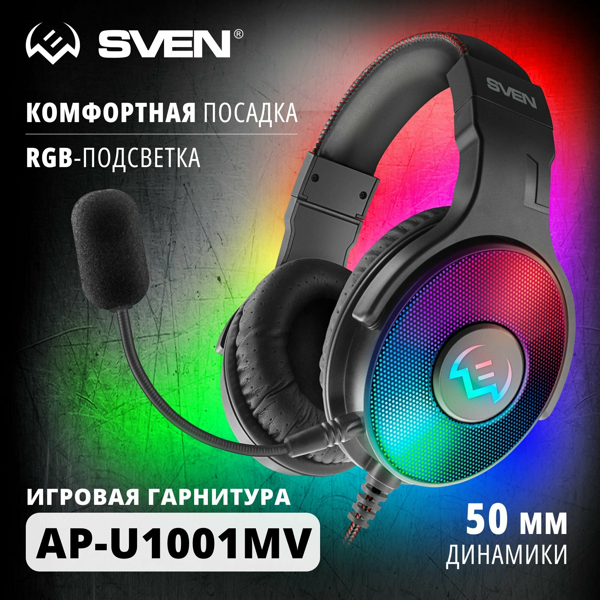 | Прочие особенности и свойства | Стереонаушники с микрофоном SVEN AP-U1001MV — это одно из топовых решений в линейке игровых гарнитур, в лучших традициях финского производителя сочетающее премиальное качество с доступной стоимостью. Внешний вид устройства сразу обращает на себя внимание благодаря крайне эффектной RGB-подсветке. В отличие от ряда бюджетных решений, светится здесь не только логотип по центру, но и вся внешняя часть корпуса чашек. Выглядит это действительно здорово и вносит огромный вклад в создание атмосферы игрового места., , Технические характеристики наушников вполне соответствуют внешнему виду — качественные драйверы диаметром 50 мм выдают оптимизированный под игровой процесс звук, который также придется по вкусу меломанам и любителям кино. Подключение посредством USB необходимо для работы подсветки, для передачи звука используется аналоговое подключение двумя штекерами jack 3,5 мм — отдельно для микрофона и наушников. Изменение громкости производится с помощью пульта на кабеле, который имеет длину 2,2 метра и способен «дотянуться» даже до далеко стоящего источника звука. А надежная тканевая оплетка придает ему дополнительную прочность и предотвращает запутывание., , Для голосовой связи в игровых чатах и онлайн-мессенджерах гарнитура оборудована микрофоном с ветрозащитой, которая способна снизить слышимость дыхания игрока для собеседников. При необходимости микрофон можно снять и использовать SVEN AP-U1001MV как обычные наушники. За комфорт ношения и отличную пассивную звукоизоляцию ответственны амбушюры из высококачественной искусственной кожи и удобное оголовье, обеспечивающее тщательно выверенный уровень прижима чашек к голове. В этих игровых наушниках можно выйти победителем из нескольких онлайн-битв подряд, не почувствовав каких-либо неудобств. Оголовье регулируется, благодаря чему наушники могут использоваться киберспортсменами любого возраста и комплекции. |