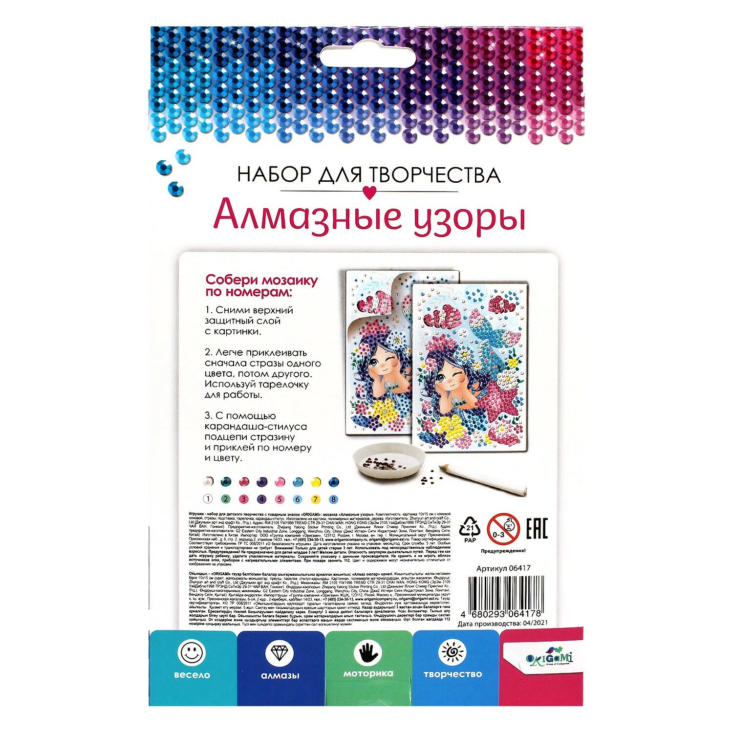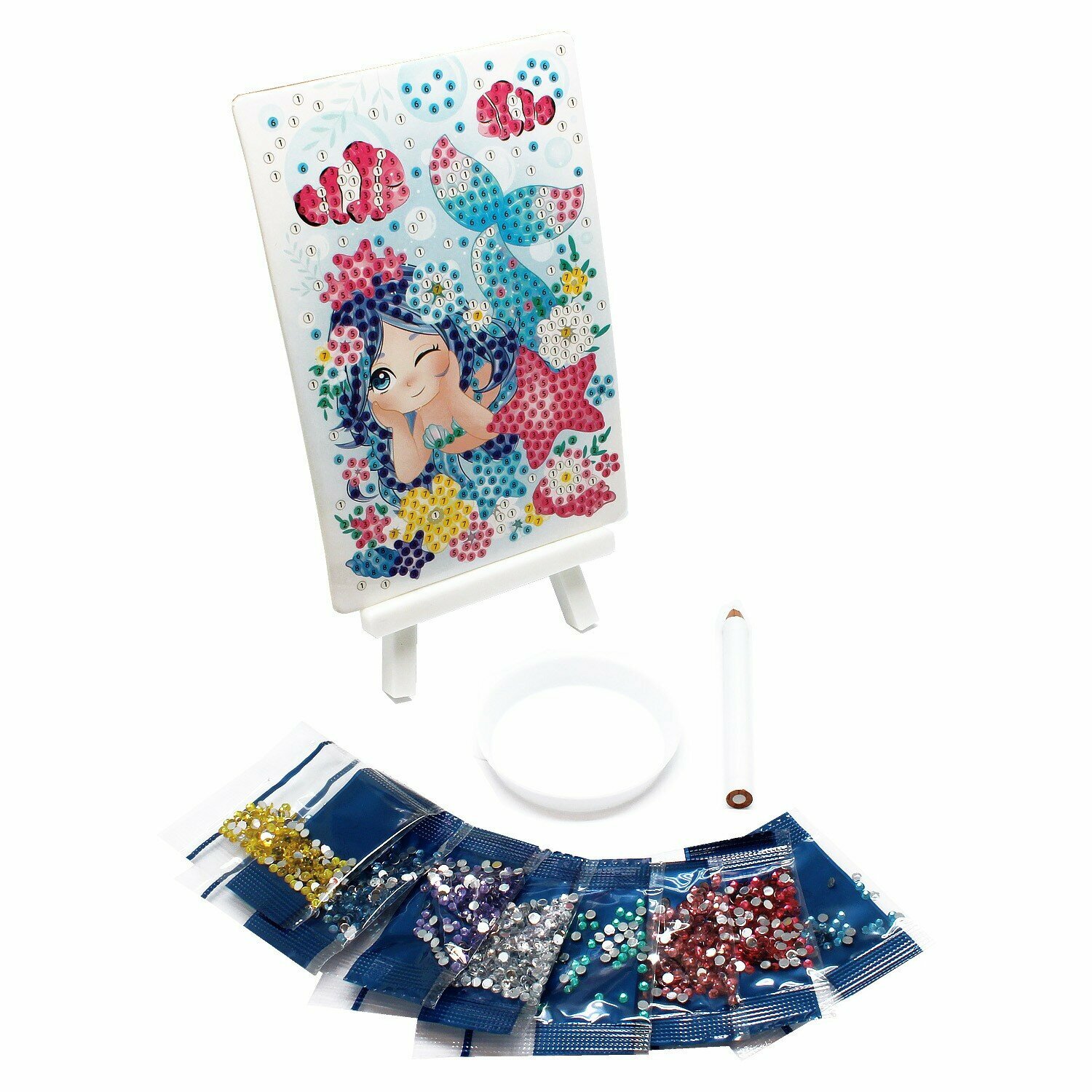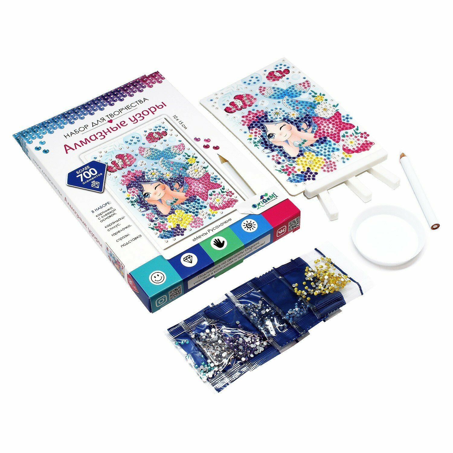 В наборе: картинка с клеевой основой, карандаш-стилус, тарелочка, стразы (более 700 элементов), подставка.