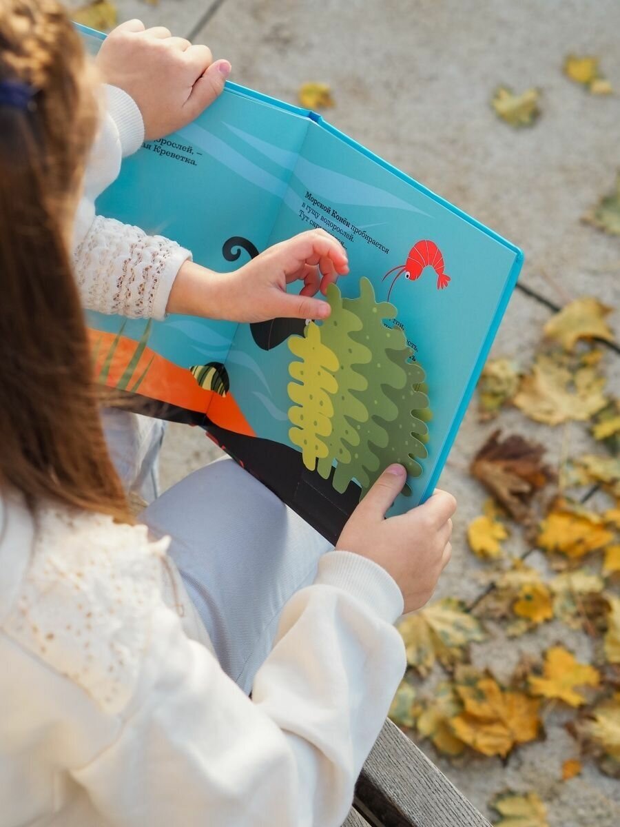 А ещё перед вами книжка, которая помогает малышу легко и быстро (практически незаметно) освоить счёт до десяти. Благодаря интерактивным элементам – клапанам – ребёнок чувствует, что сам принимает участие в приключениях Морского конька, и лучше запоминает цифры.