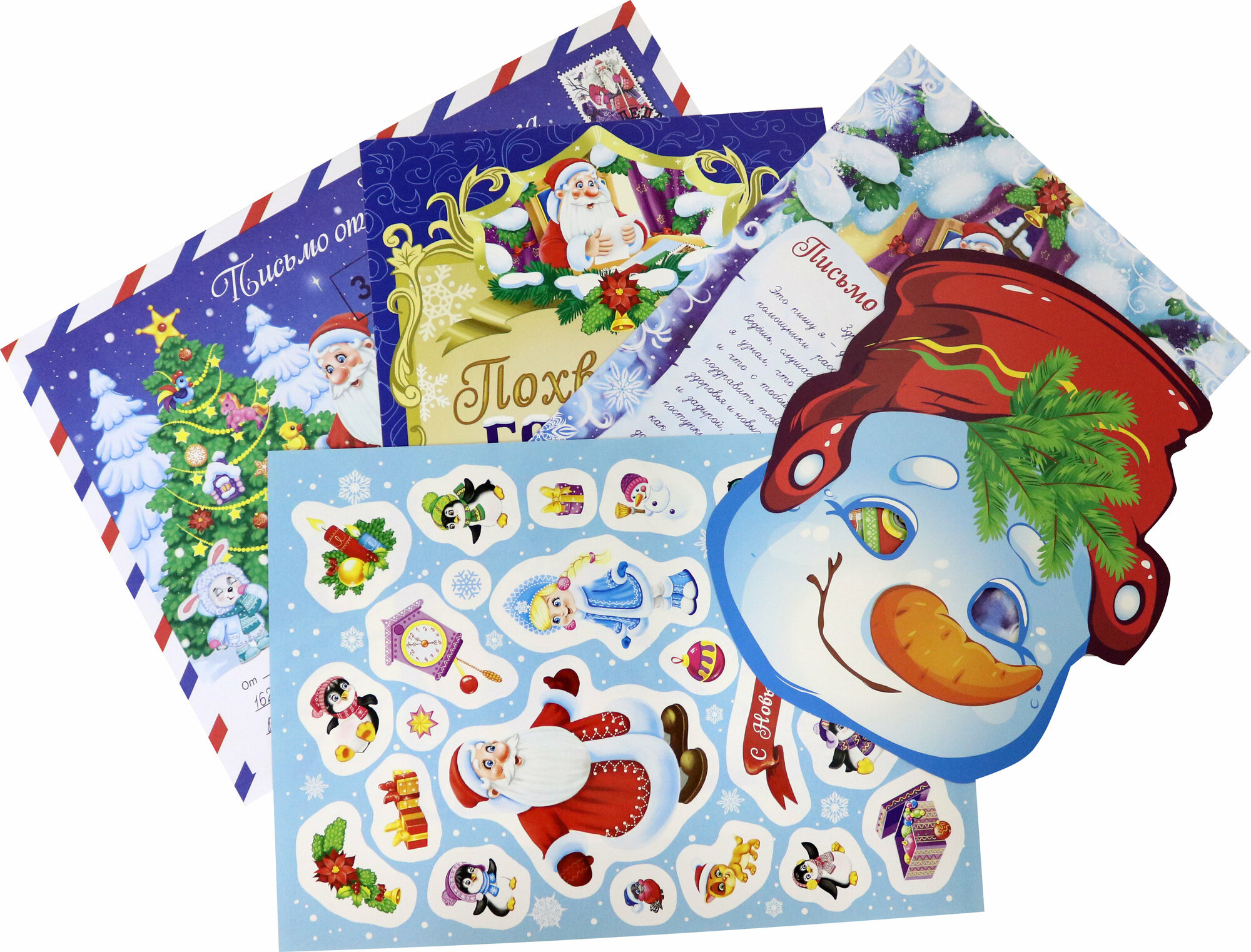 В набор входят: почтовый конверт, бланк письма от Деда Мороза, похвальная грамота, карнавальная маска Снеговика и лист с новогодними наклейками.