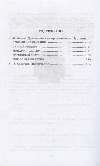 В книгу входят драматические произведения Пушкина: "Скупой рыцарь", "Моцарт и Сальери", "Каменный гость", "Пир во время чумы", - объединенные в цикл "Маленькие трагедии". Поставленные с необыкновенной резкостью и остротой психологические, исторические или философские проблемы развиваются в этих произведениях во всей трагической противоречивости.