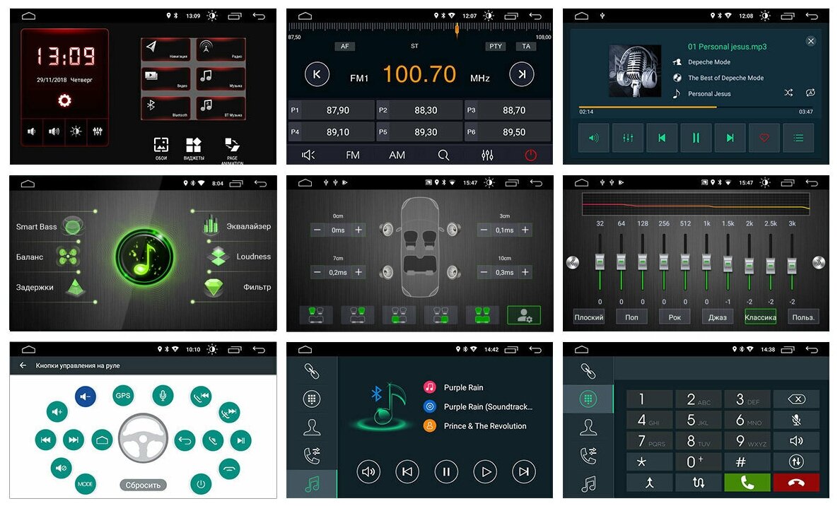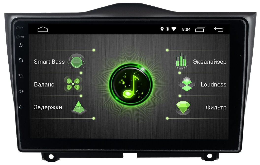 Чем шире диапазон настроек эквалайзера, тем точнее настройки частотной характеристики системы. Прежде, пользователи довольствовались всего двумя настройками темброблока: Bass и Treble (Бас и Высокие). Встроенный в DSP эквалайзер, позволяет управлять звучанием системы в зависимости от ваших потребностей и предпочтений. Настройка осуществляется уменьшением или увеличением громкости каждой из тридцати частотных полос (эквалайзер располагается на трех экранах устройства). Если Вы не хотите вникать в детали, то можете воспользоваться одним из имеющихся режимов предустановок: Рок, Поп, Джаз, Классика, Плоский или Пользователь. В режиме «Пользователь» можно сохранить индивидуальную схему настроек эквалайзера.