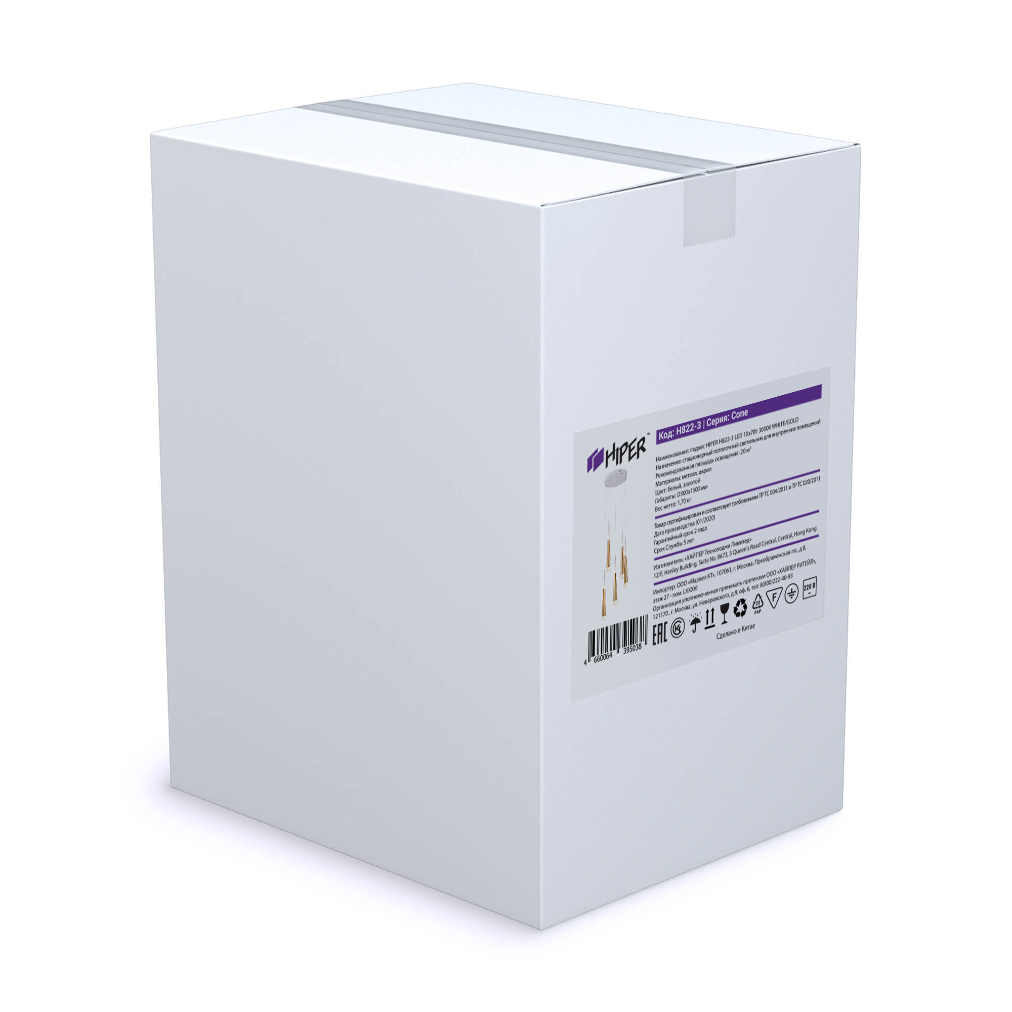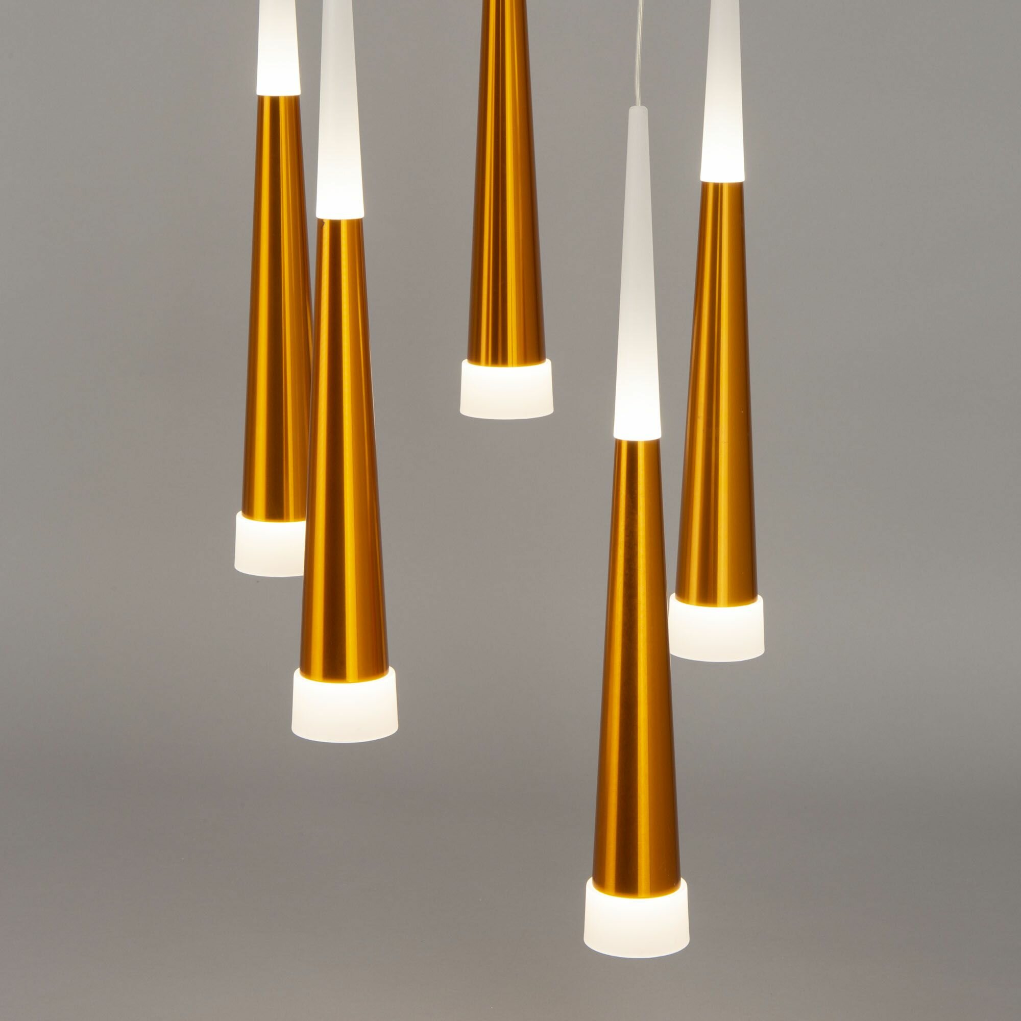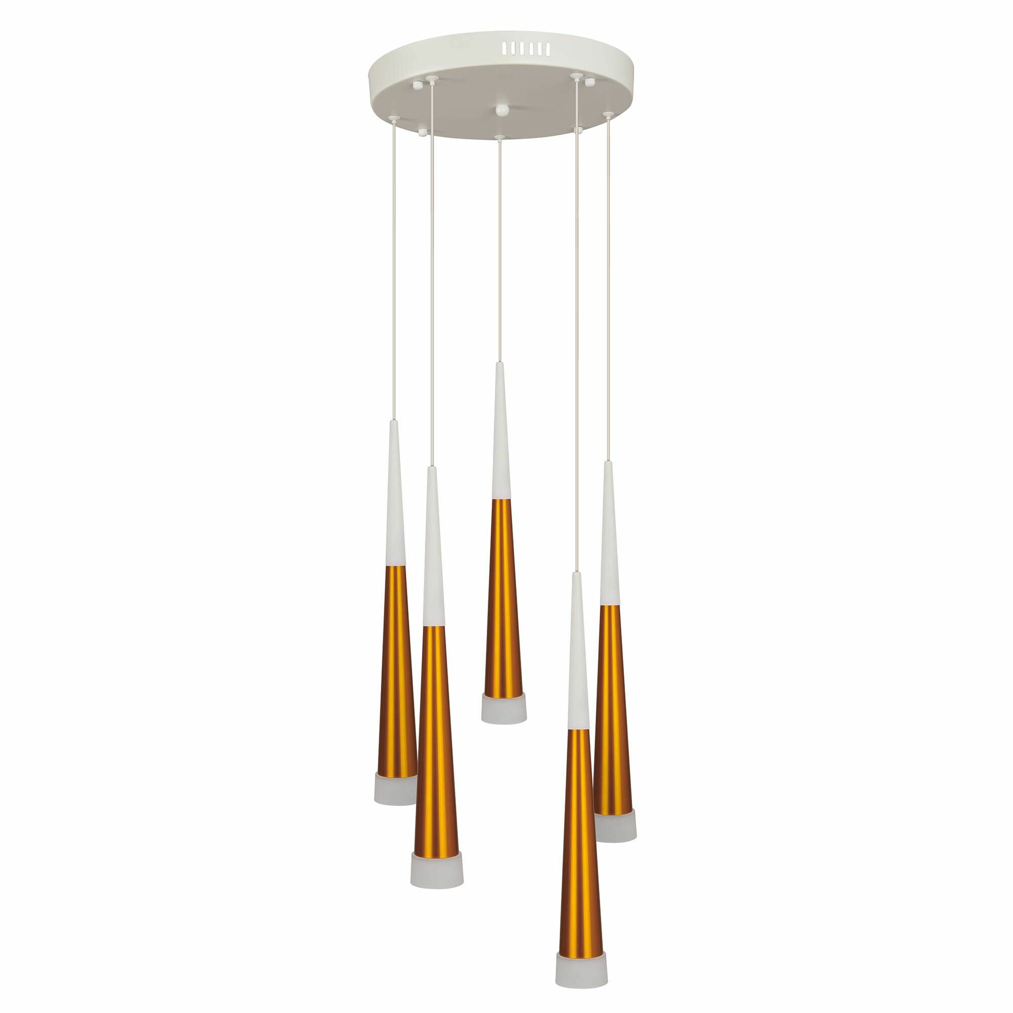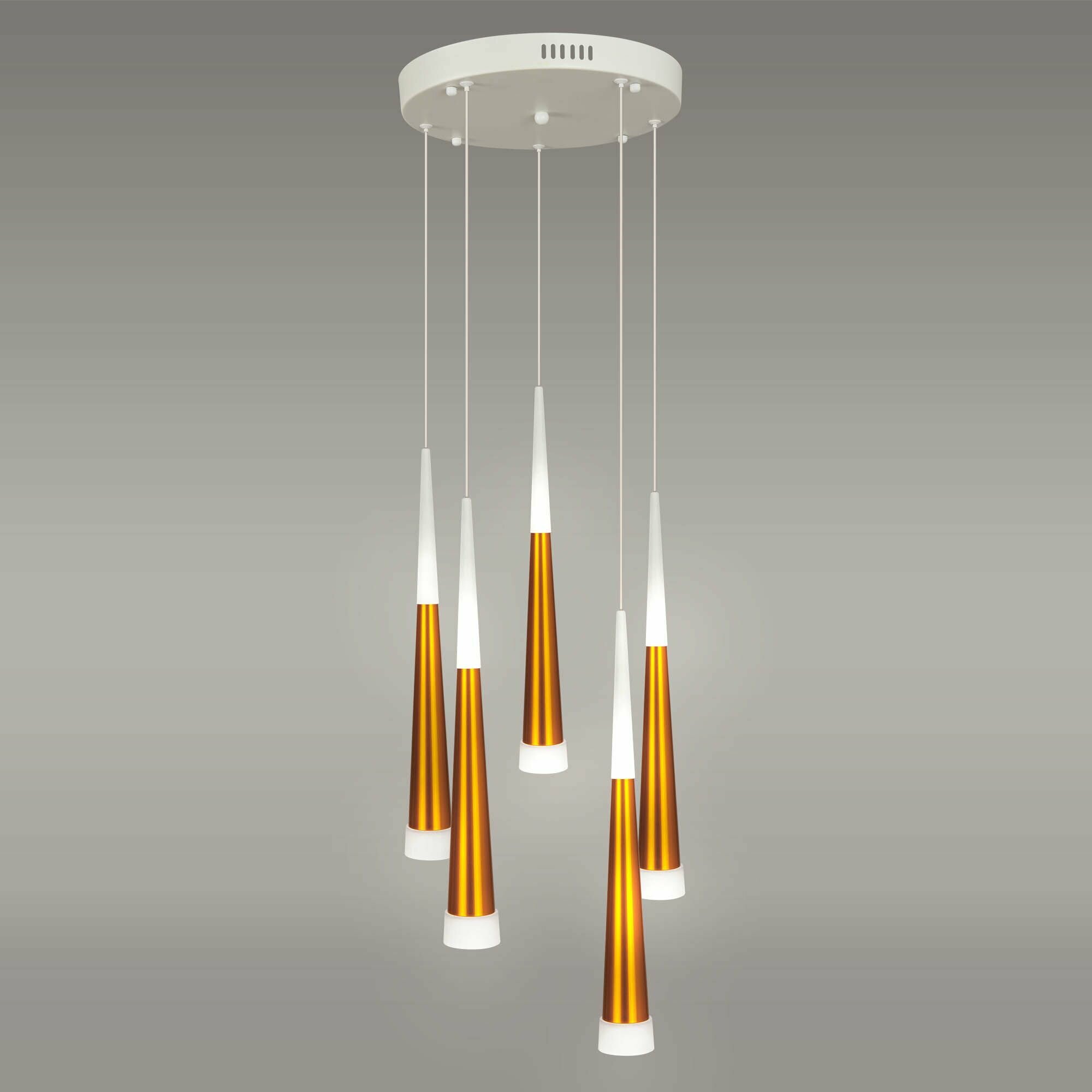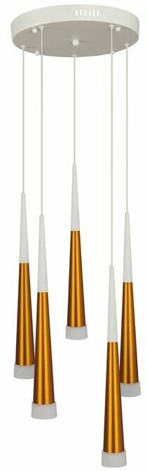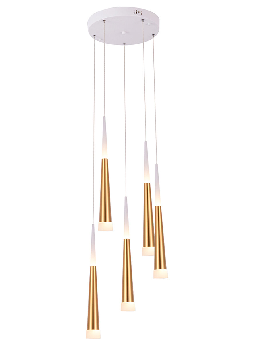 Подвесной светильник светодиодный H822-3 из серии Cone от английского производителя Hiper украсит гостиную, спальню, кухню в стиле модерн. Материал основы — металл, цвет — золото. Светильник имеет 5 плафонов из металла и акрила. Светодиодные лампочки обладают мощностью 70W и цветовой температурой 3000К. Площадь освещения составит до 20 кв. м, питание от напряжения 220V. Монтаж производится на пластину. Габариты: длина — 30 см, ширина — 30 см, высота — 120 см, диаметр — 30 см.