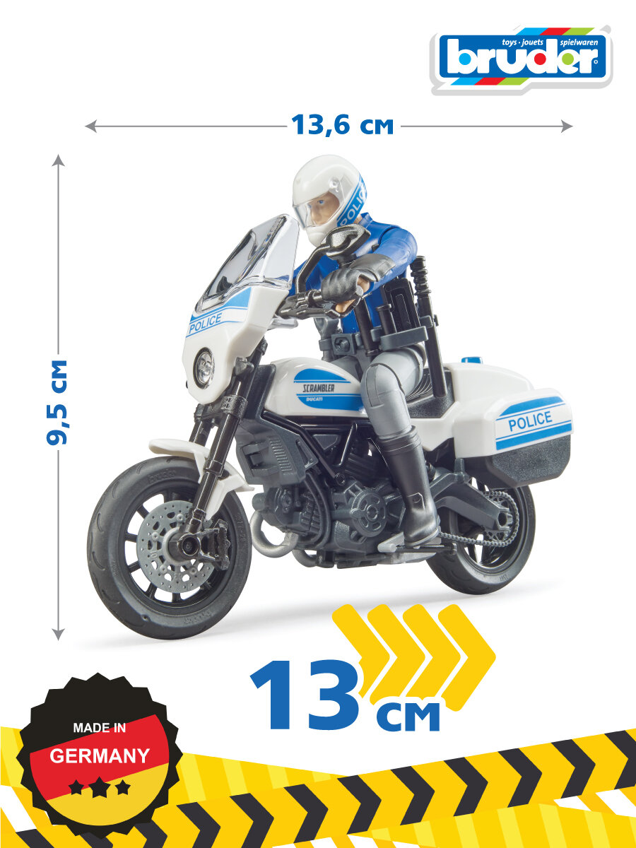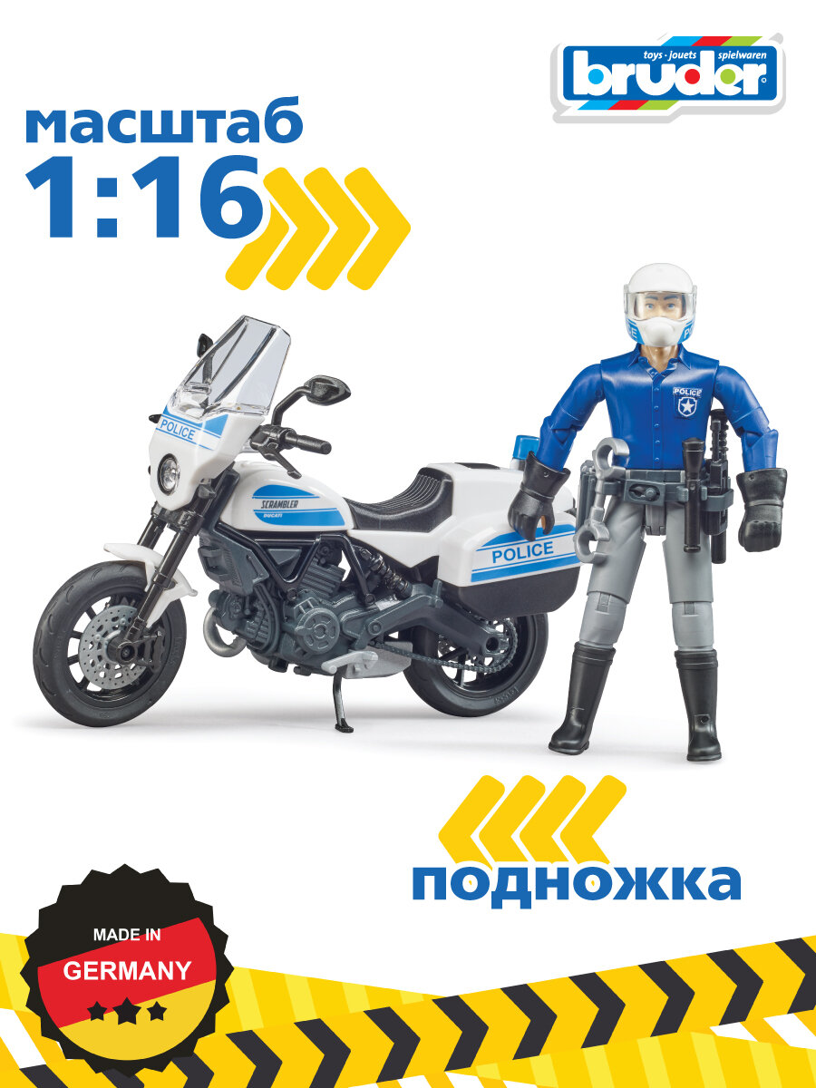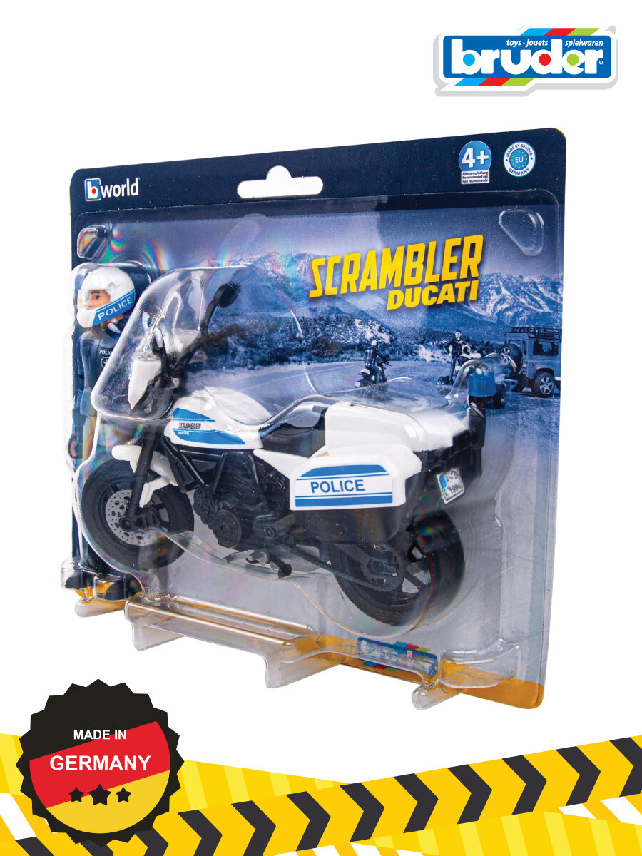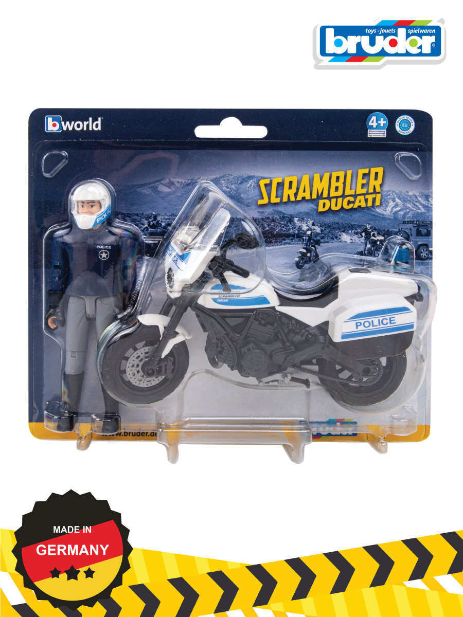 "Полицейский мотоцикл Scrambler Ducati полностью имитирует настоящий. Так же как и настоящий, у мотоцикла Bruder резиновые шины, поворачивается руль, амортизирующая задняя подвеска. На мотоцикл можно посадить любую фигурку Bruder. В набор входит: - мотоцикл; - фигурка полицейского;- аксессуары: шлем, перчатки. Фигурка и мотоцикл выполнены из ударопрочного пластика и подходят для игры дома и на улице. Масштаб 1:16