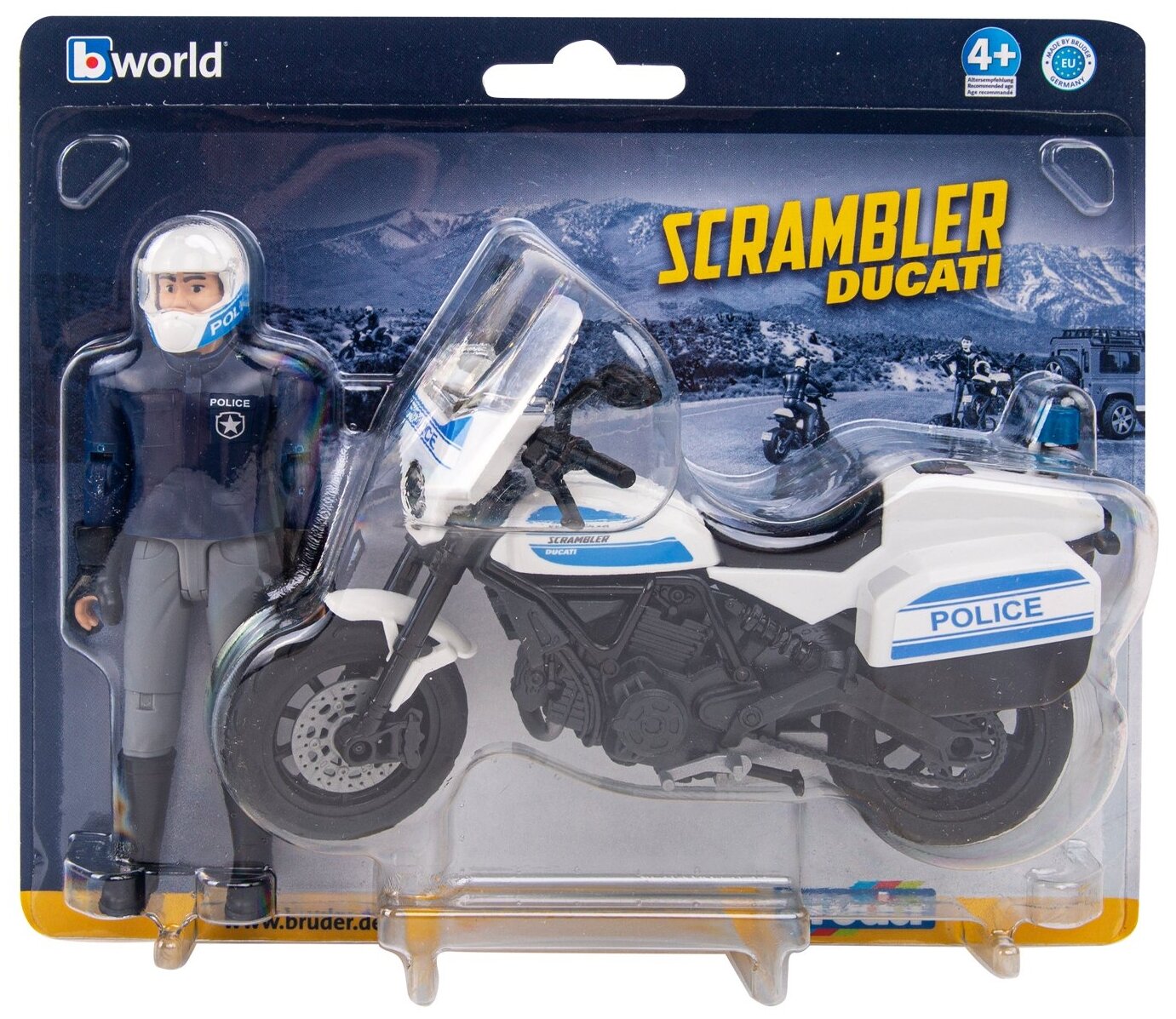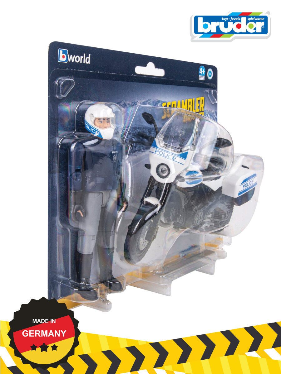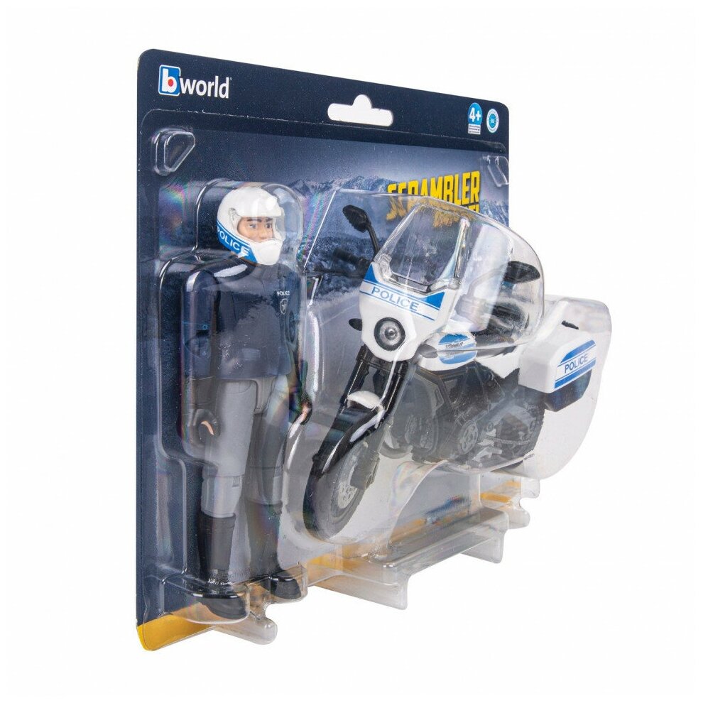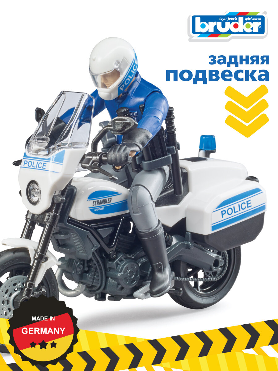 "Полицейский мотоцикл Scrambler Ducati полностью имитирует настоящий. Так же как и настоящий, у мотоцикла Bruder резиновые шины, поворачивается руль, амортизирующая задняя подвеска. На мотоцикл можно посадить любую фигурку Bruder. В набор входит: - мотоцикл; - фигурка полицейского;- аксессуары: шлем, перчатки. Фигурка и мотоцикл выполнены из ударопрочного пластика и подходят для игры дома и на улице. Масштаб 1:16