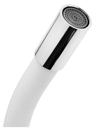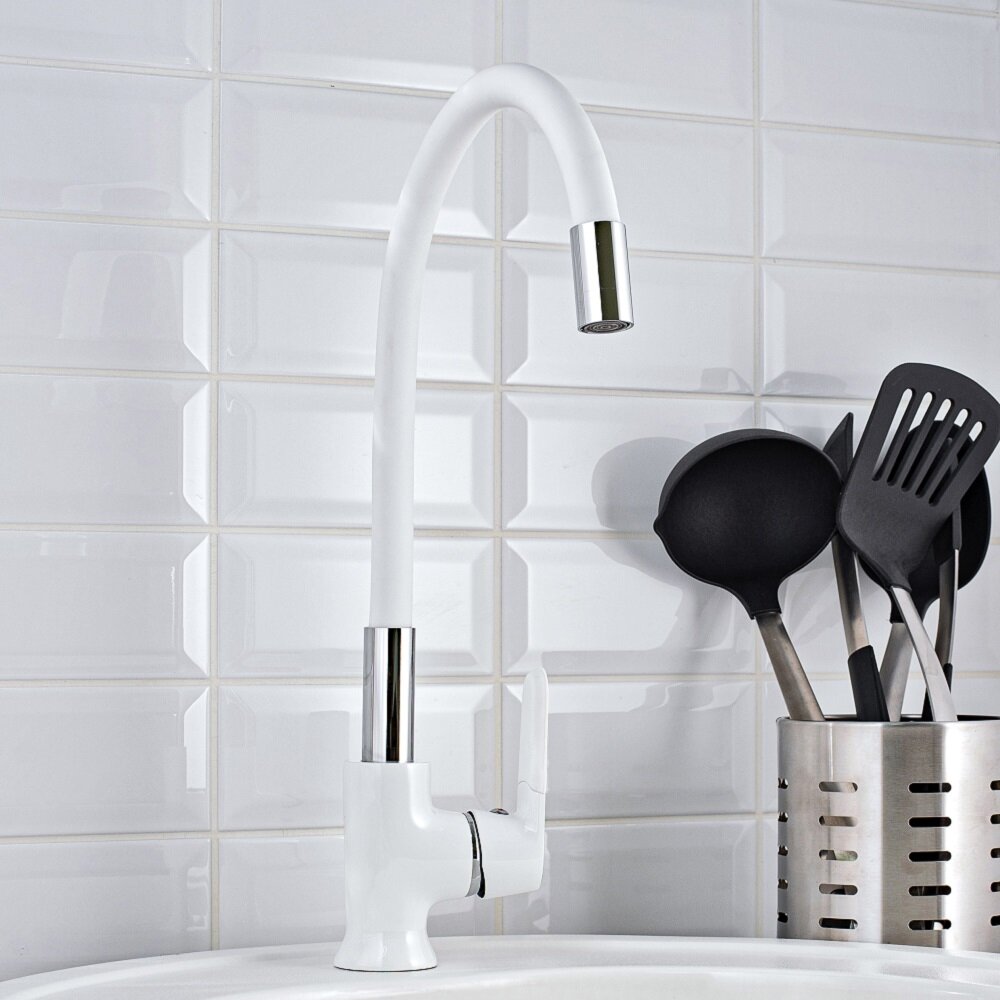 Стильный однорычажныйй смеситель для кухни с высоким гибким изливом эргономичен в использовании и эффектно подчеркивает интерьер за счет элегантного белого оттенка дизайна.