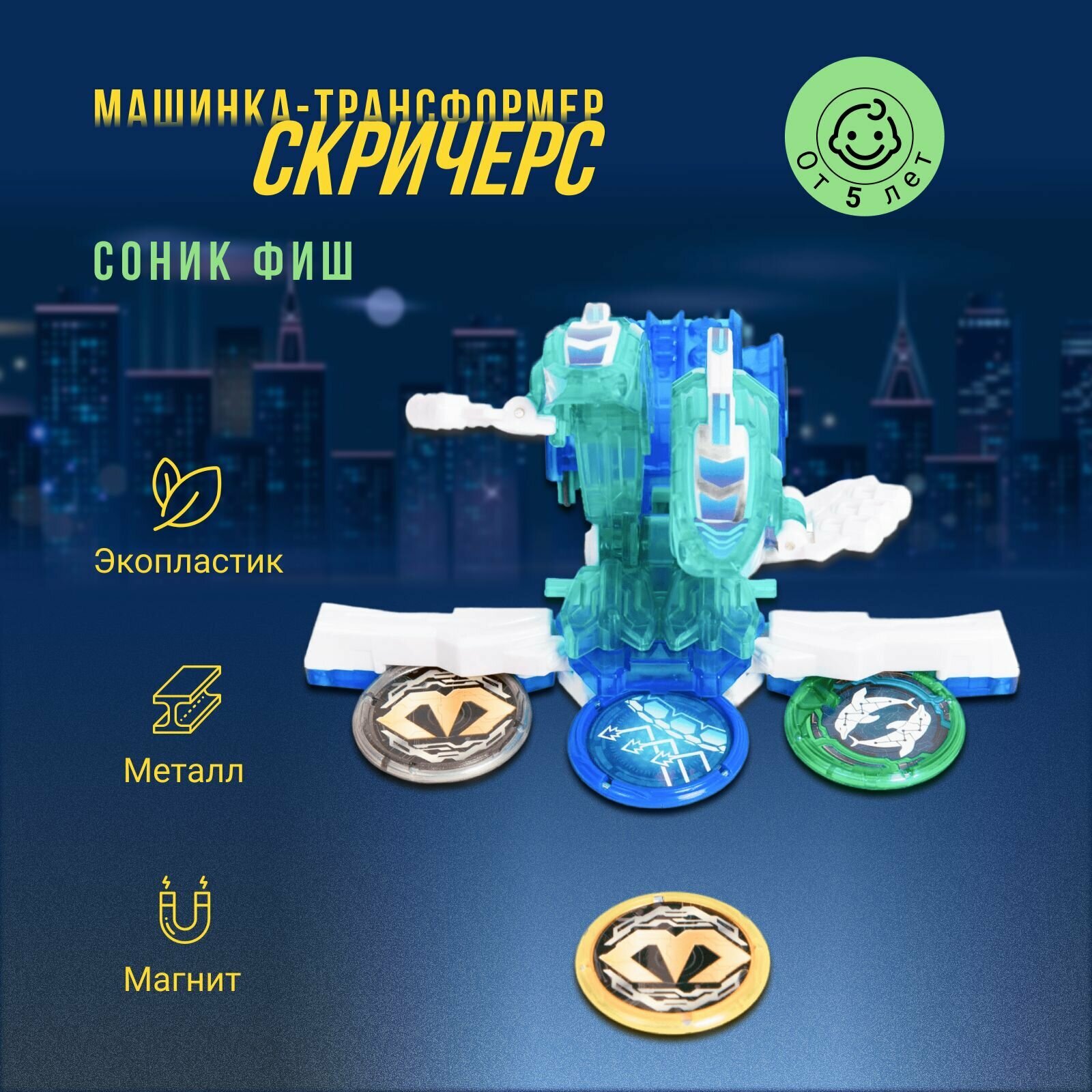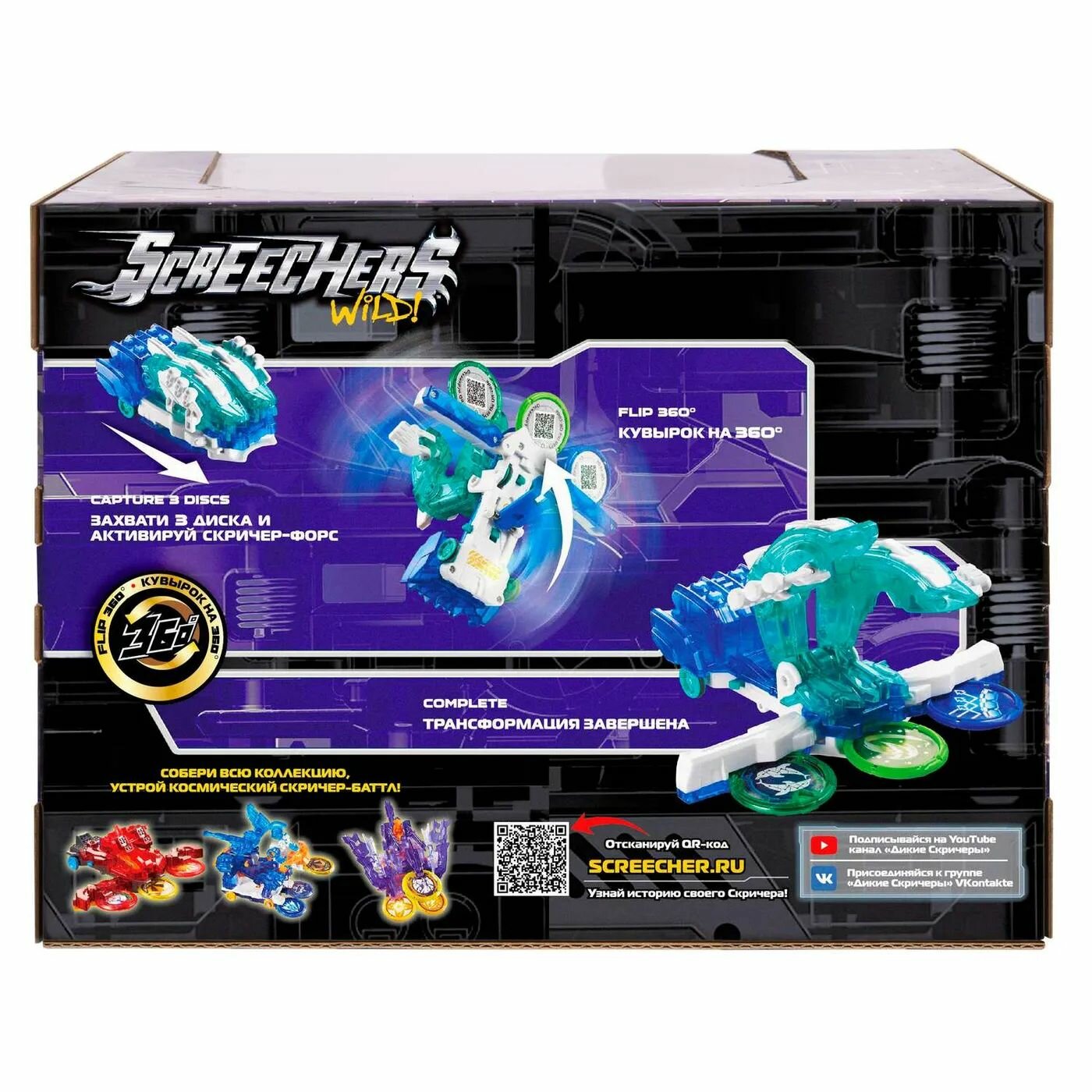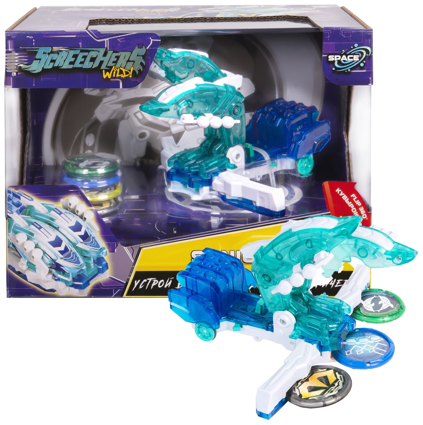 Дикие Скричеры выходят на Галактический уровень баттлов! Коллекция Space - новые яркие трансформации, мощные кувырки и высокий уровень детализации Скричеров! Яркая трансформация Скричер-Форс – крупный размер и устрашающий внешний вид приведут к победе в баттле! Дикий Скричер Соник Фиш из линейки S3 разгоняется, захватывает 3 диска и активирует скричер-форс, делает кувырок на 360° и самостоятельно трансформируется прямо в воздухе. Обратно в машинку игрушка собирается вручную. Несколько движений - и она готова к новому кувырку. В набор входит машинка-трансформер (10.5х5.5х6 см), 4 трансформационных диска диаметром 3 см и инструкция на русском языке. Игрушка упакована в коробку с окном (22х17х16 см). Играть со Скричером можно где угодно, никаких дополнительных приспособлений не требуется. Товар сертифицирован. Производитель машинок "Скричер" - международная компания Alpha Group. Эксклюзивный дистрибьютор бренда "Дикие Скричеры" на территории РФ - компания "РОСМЭН". Собери всю коллекцию, устрой космический скричер-баттл!