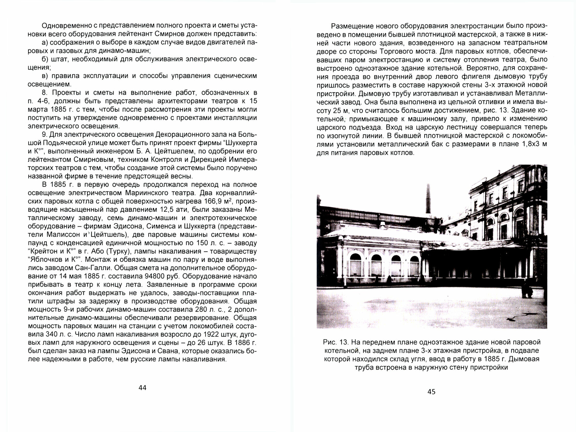 Третья часть очерков, продолжающая публикацию серии статей по истории российской теплоэнергетики. В Императорских театрах Санкт-Петербурга и Москвы в конце 19 века в короткий период появилось электрическое освещение. История его создания очень индивидуальна для разных театров и сегодня практически забыта. В книге делается попытка воссоздать ее заново на основе архивных документов, диссертаций, публикаций 19 века. Уделяется внимание различным проектам, включая нереализованные, а также их исполнителям и историческому фону, на котором происходили описываемые события. Книга иллюстрирована архивными чертежами, фотографиями и рисунками.