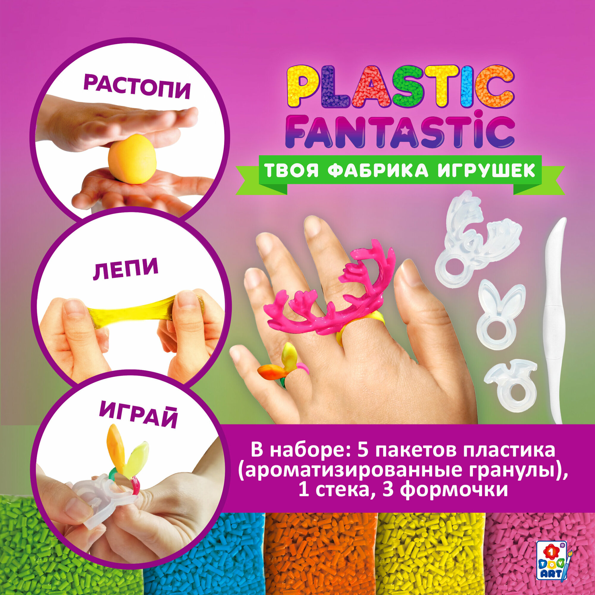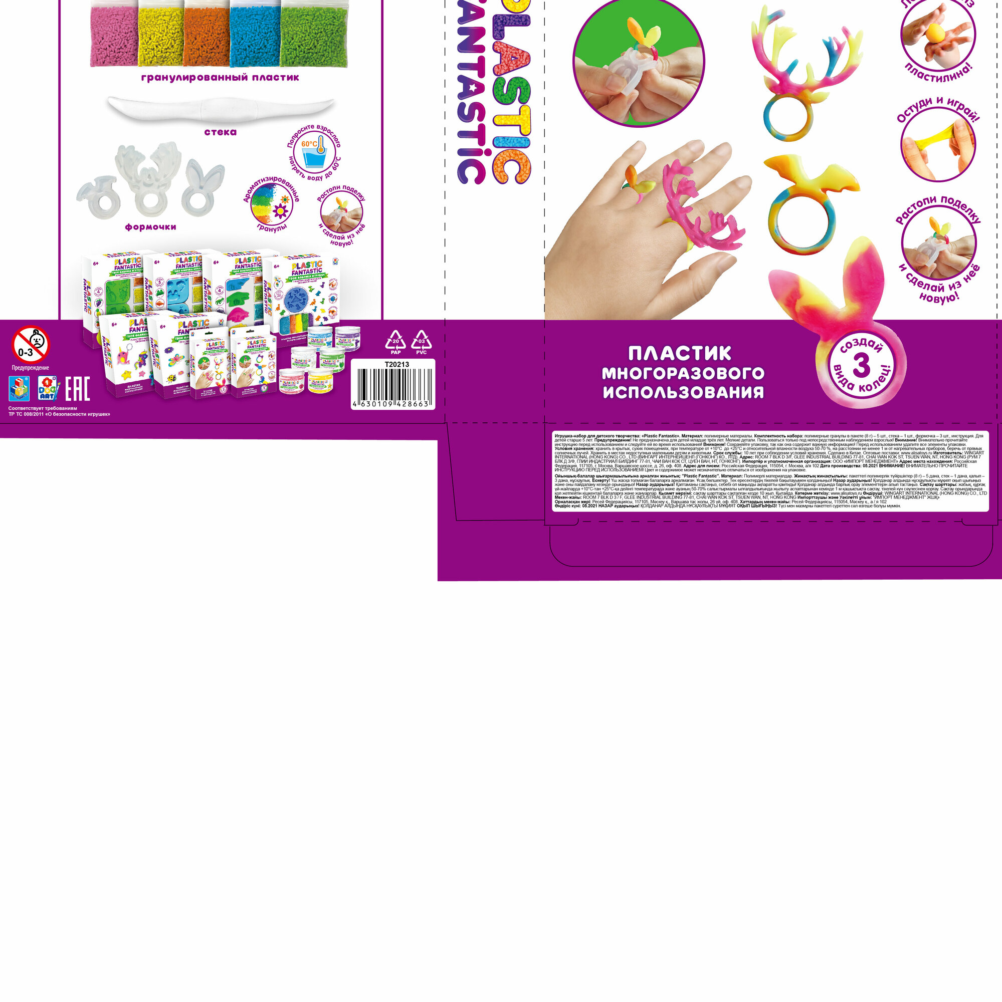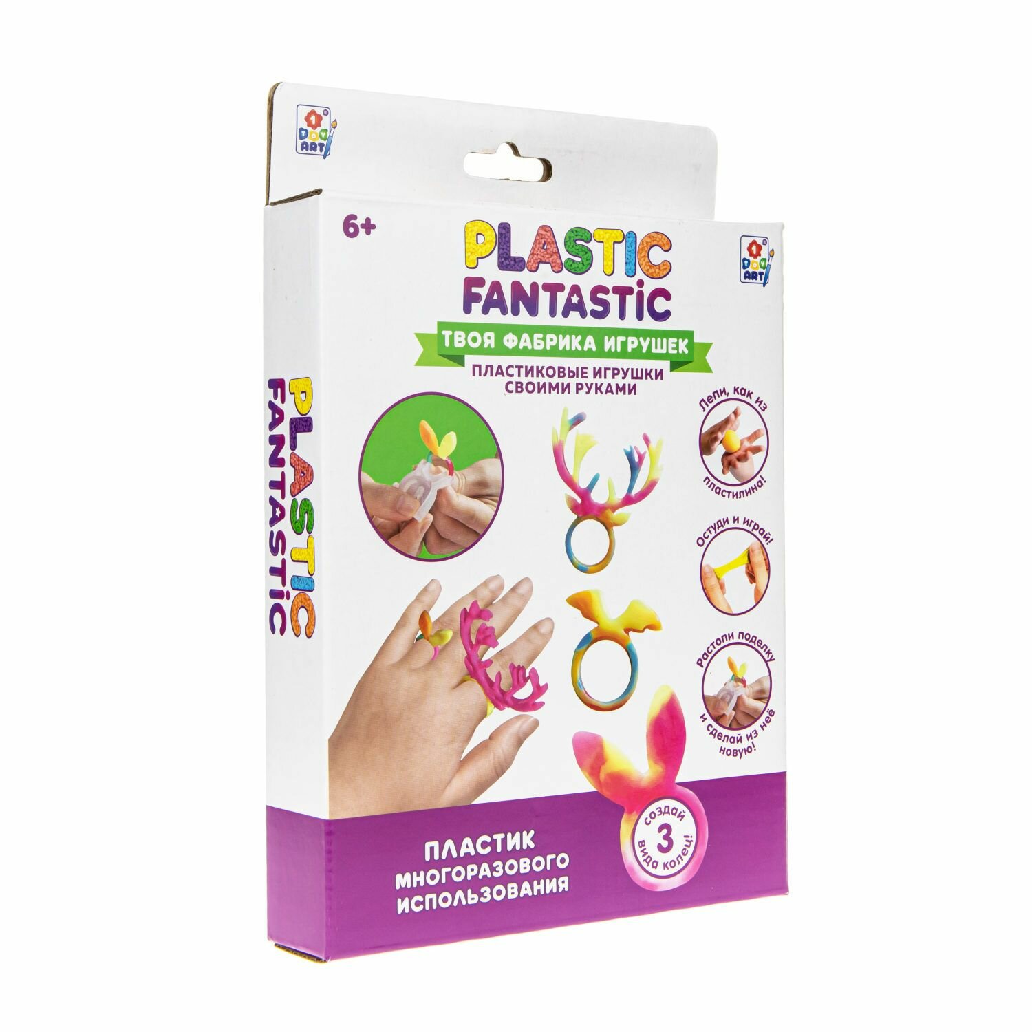 Набор для творчества Набор "Кольца" Оленёнок, Кролик, Летучая мышь Т20213 Plastic Fantastic Комплект: полимерный материал Материал: полимерный материал Упаковка: картонная коробка с подвесом Размер упаковки: 20*13*3 см. Возраст: 6+ Страна обладатель бренда: Россия Набор для творчества - прекрасный подарок для юных рукодельниц, которые любят создавать нетривиальные украшения ручной работы и выделяться посредством яркого образа. Plastic Fantastic - это эксклюзивная линейка наборов для изготовления игрушек, украшений и брелоков из гранулированного пластика. Пластик растворяется в воде при температуре 60°С и становится эластичным. Девочки смогут самостоятельно изготовить различные кольца, подобрать их под цвет одежды. В комплект входят все необходимые элементы и подробная инструкция. Оригинальный набор позволит реализовать свой творческий потенциал и проявить фантазию в дизайне украшений. Он развивает эстетический вкус, внимание, усидичивость и подарит множество ярких эмоций.