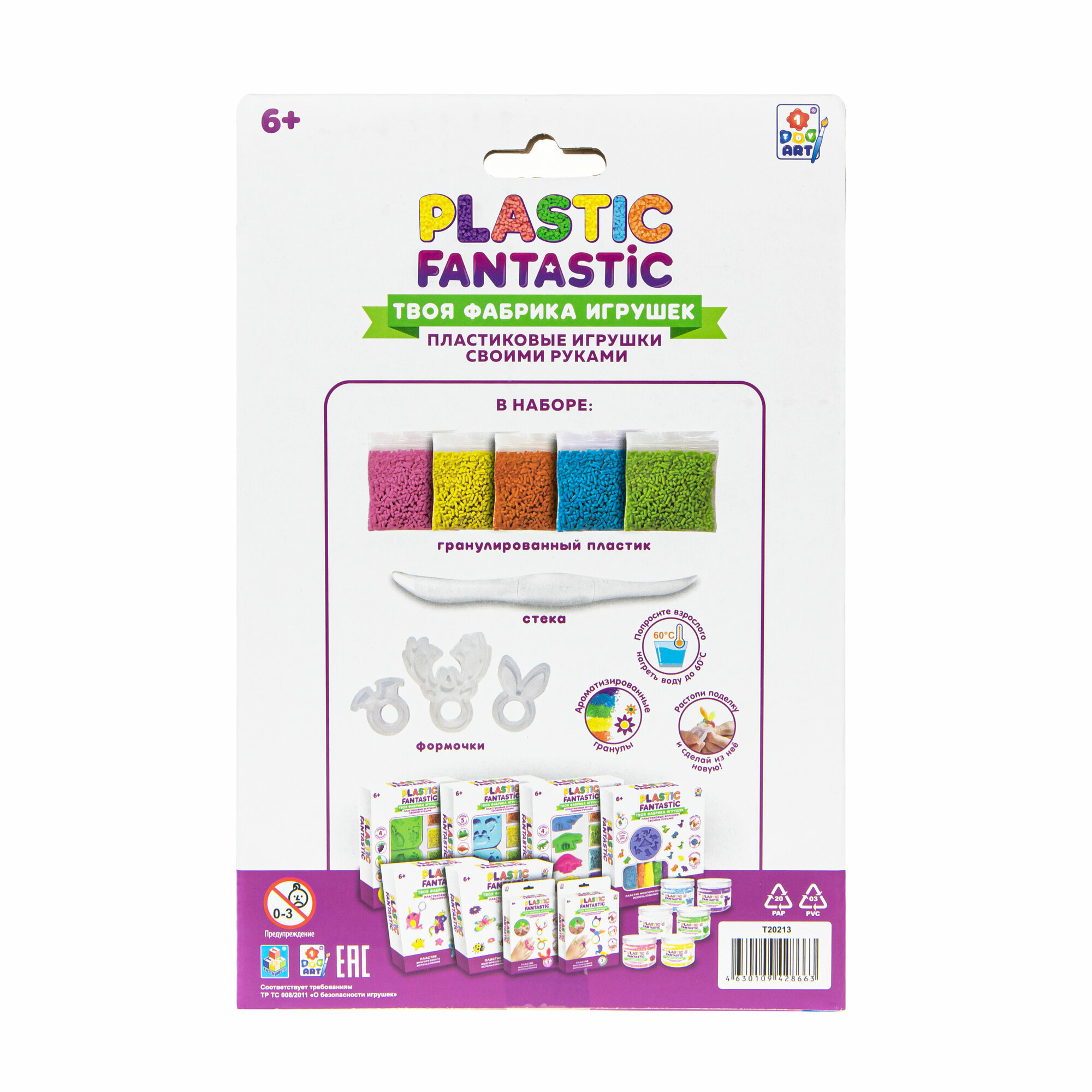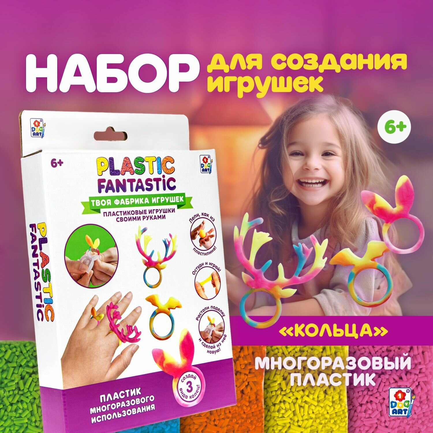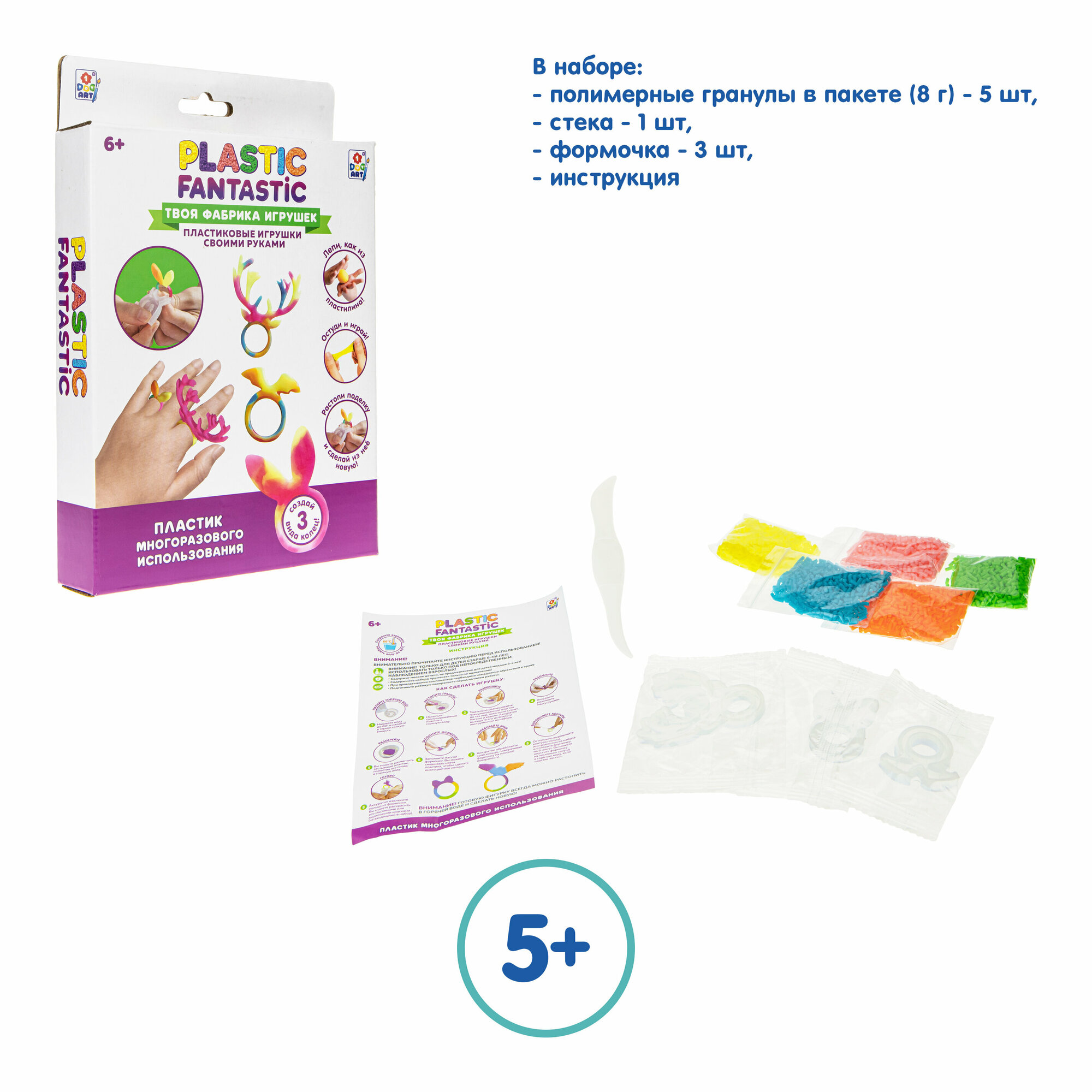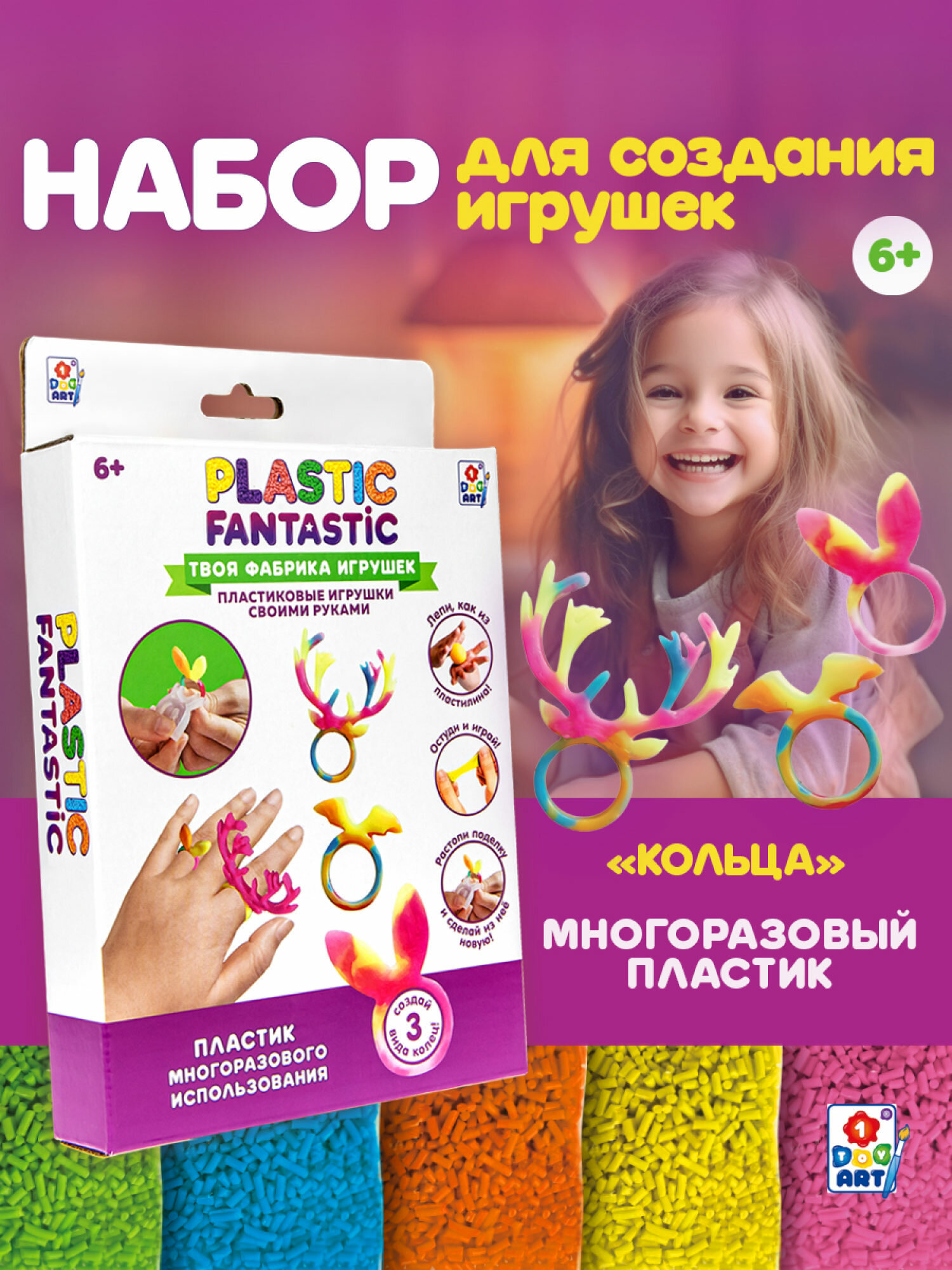 Набор для творчества Набор "Кольца" Оленёнок, Кролик, Летучая мышь Т20213 Plastic Fantastic Комплект: полимерный материал Материал: полимерный материал Упаковка: картонная коробка с подвесом Размер упаковки: 20*13*3 см. Возраст: 6+ Страна обладатель бренда: Россия Набор для творчества - прекрасный подарок для юных рукодельниц, которые любят создавать нетривиальные украшения ручной работы и выделяться посредством яркого образа. Plastic Fantastic - это эксклюзивная линейка наборов для изготовления игрушек, украшений и брелоков из гранулированного пластика. Пластик растворяется в воде при температуре 60°С и становится эластичным. Девочки смогут самостоятельно изготовить различные кольца, подобрать их под цвет одежды. В комплект входят все необходимые элементы и подробная инструкция. Оригинальный набор позволит реализовать свой творческий потенциал и проявить фантазию в дизайне украшений. Он развивает эстетический вкус, внимание, усидичивость и подарит множество ярких эмоций.