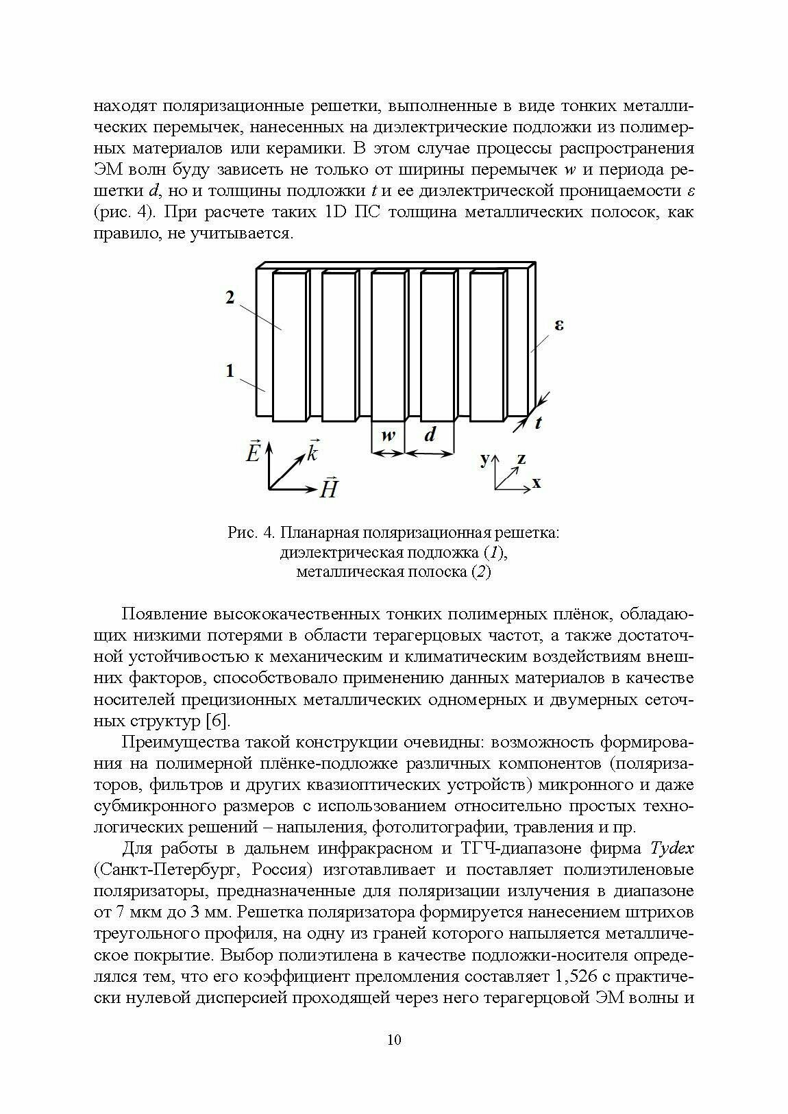 В учебном пособии рассмотрены вопросы распространения, поглощения и рассеяния линейно поляризованных электромагнитных волн в одномерных (1D), двумерных (2D) и трехмерных (3D) периодических структурах, описаны методы их математического моделирования и технологической реализации, приведены примеры практического использования в различных устройствах микроволновой и терагерцевой техники.