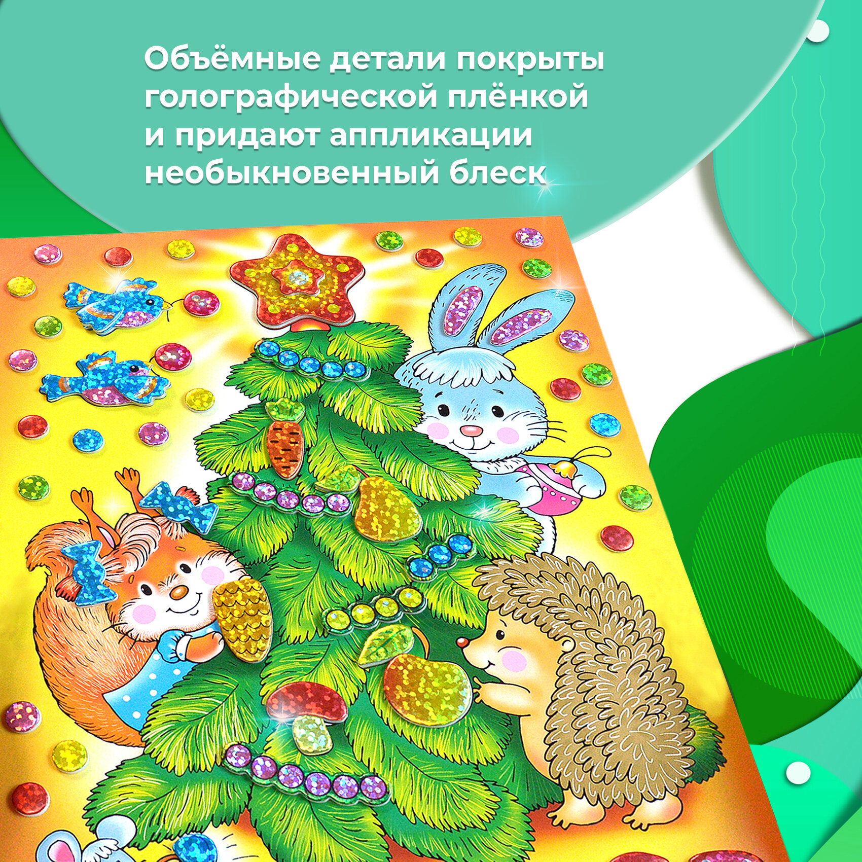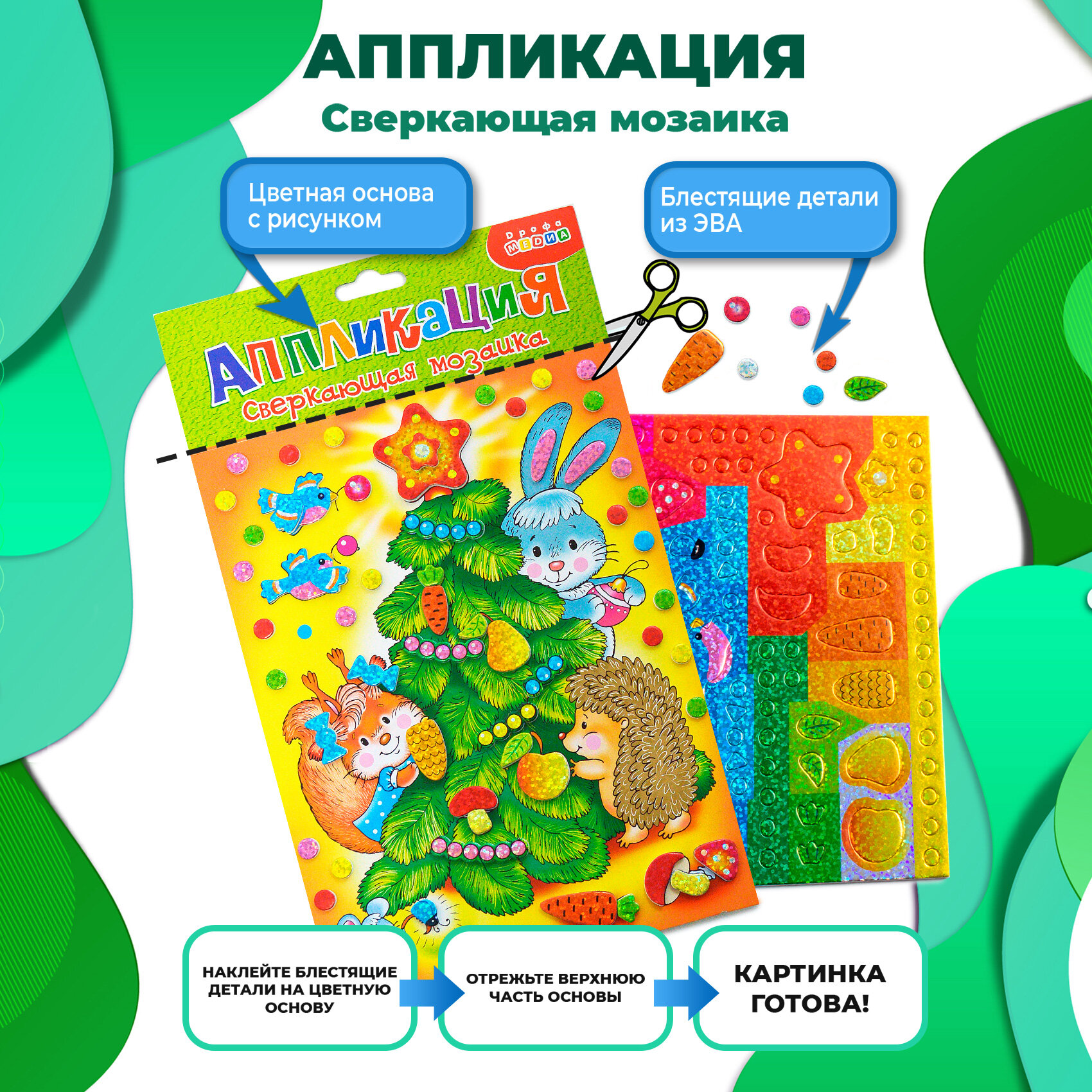 Праздничная и яркая аппликация, состоящая из красочных деталей, отличающихся по форме и размерам. Готовое изделие эффектно переливается всеми цветами радуги, благодаря покрытию деталей мозаики голографической плёнкой, придающей им необыкновенный блеск.
