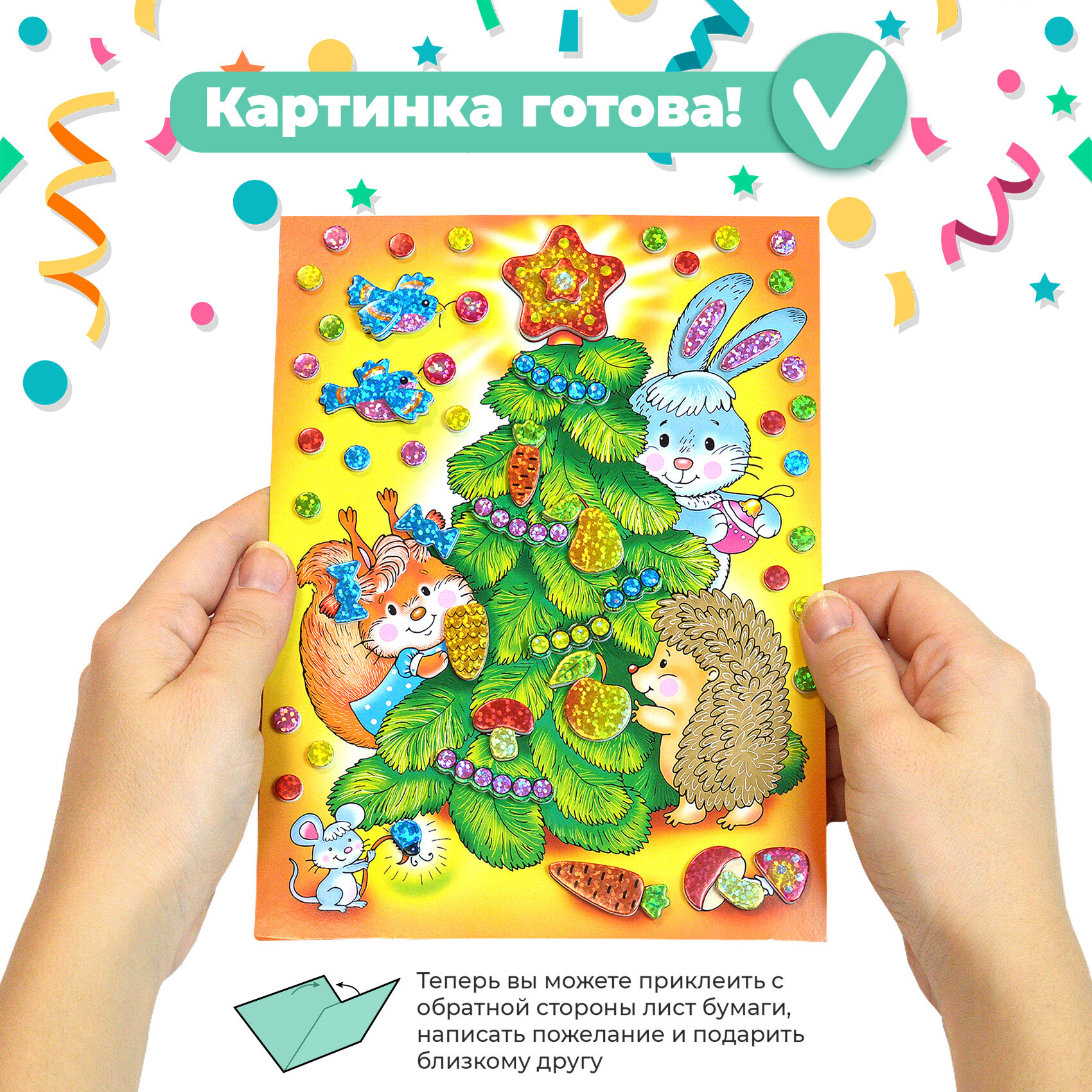 Малыш легко справится с работой, ведь ему не нужны ни клей, ни ножницы: объёмные детали легко приклеятся на картонную основу. Готовая картинка станет прекрасным подарком для родных и друзей, или просто украшением детской комнаты.