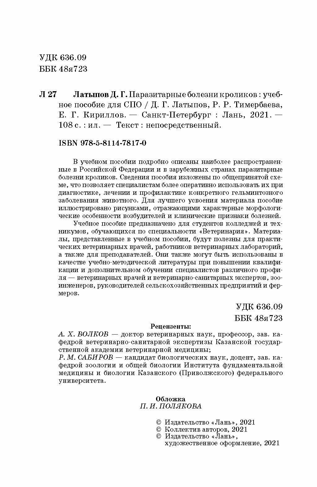 Паразитарные болезни кроликов.СПО (Латыпов Далис Гарипович, Тимербаева Разалия Рустамовна, Кириллов Евгений Геннадьевич); Лань, 2021