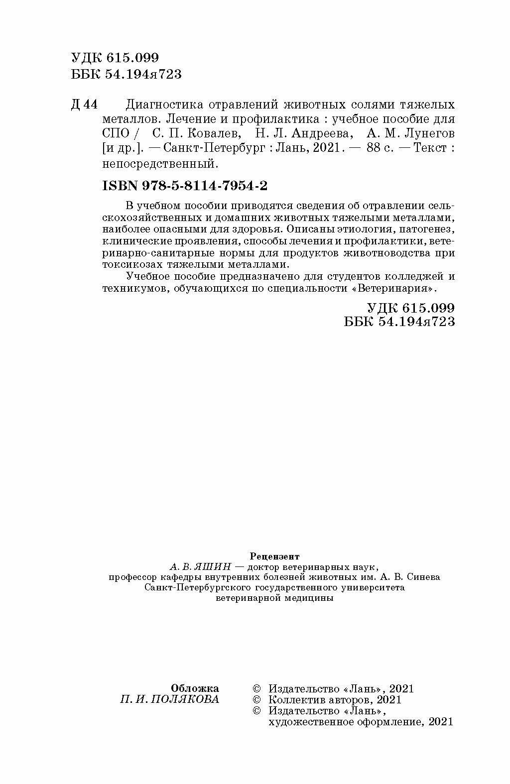 Диагн.отравл.живот.солями тяж.метал.Леч.и проф.СПО (Ковалев Сергей Павлович, Лунегов Александр Михайлович, Андреева Надежда Лукьяновна); Лань, 2021