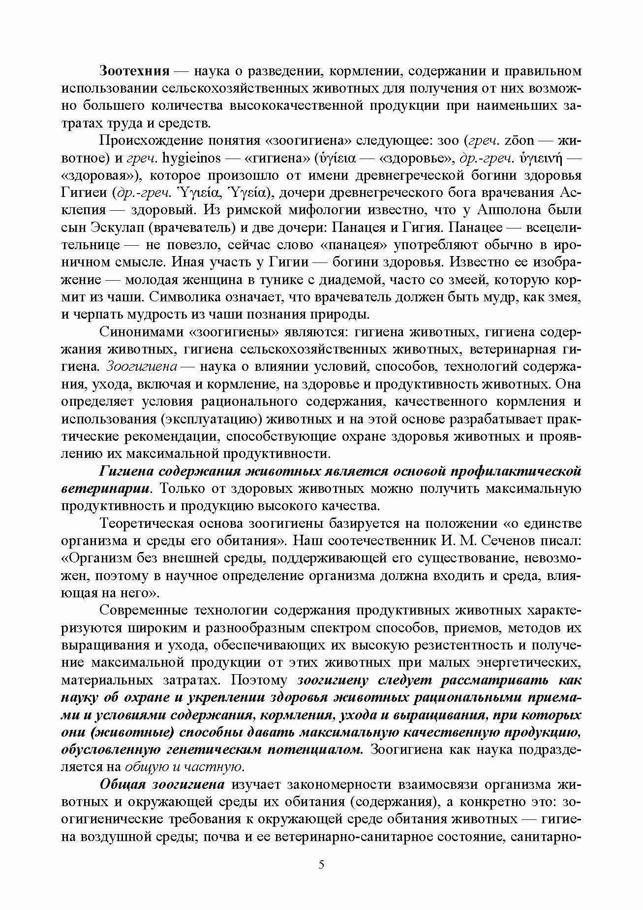 Учебник составлен с учетом требований федеральных государствен-ных образовательных стандартов высшего образования по направлениям подготовки кадров по ветеринарии и зоотехнии. В нем излагаются совре-менные подходы в области гигиены животных, как среды их обитания. В учебнике подробно изложены зоогигиенические требования к окружаю-щей среде обитания (содержания) животных, а именно: гигиена воздуш-ной среды; почва и ее ветеринарно-санитарное состояние, санитарно-гигиеническое качество воды, водоснабжения и поения животных; сани-тарно-гигиеническое качество кормов и кормления; требования к выботу участка для ферм и основы его планировки; ветеринарно-санитарные и технолого-гигиенические требования к помещениям, к качеству строи-тельных материалов и системам в них жизнеобеспечения: вентиляции, отоплению, канализации и навозоудалению; гигиене ухода за живот-ными, гигиене их транспортировки и т. д. Учебник содержит материал по общехозяйственным и ветеринарно-санитарным мероприятиям, обеспечивающим ветеринарное благополучие на фермах и комплексах (санитарно-защитные зоны, зооветеринарные разрывы, профилактиче-ские перерывы, дезинфекция, дератизация, дезинсекция, дезодорации и т. д.). Все материалы изложены с учетом современных достижений в области фундаментальной науки и инновационных технологий. В учеб-нике представлен краткий словарь основных терминов и понятий в зооги-гиене.