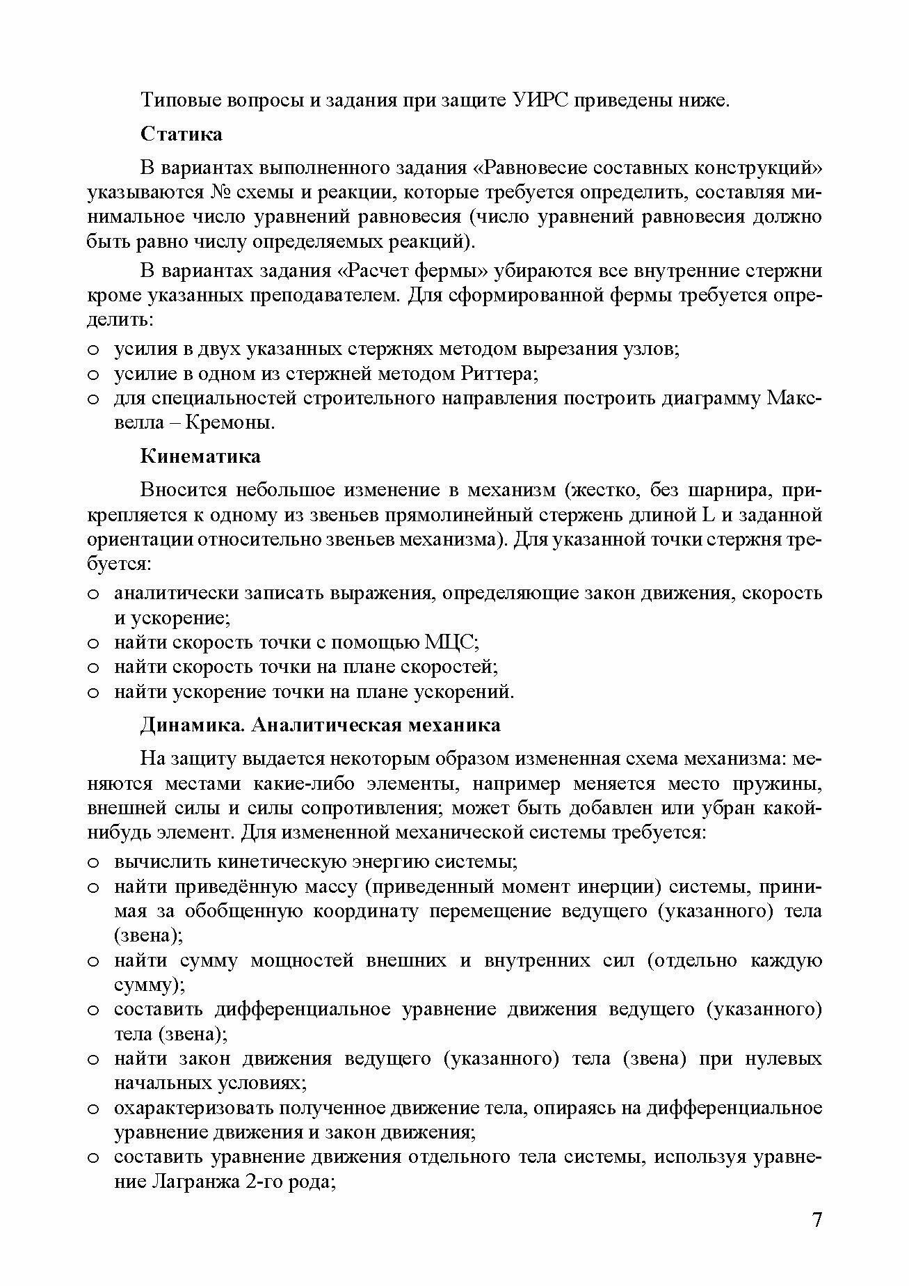 Данное учебное пособие посвящено методике выполнения студентами индивидуальных заданий в рамках УИРС по теоретической и прикладной механике. Сборник содержит 7 заданий учебно-исследовательской работы по всем основным разделам теоретической и прикладной механики (кинематика – 1, статика – 3, динамика, аналитическая и прикладная механика – 3 задания). Приведены альбомы заданий и примеры их выполнения, на основе которых студенты (особенно заочных и вечерних форм обучения) смогут выполнить их самостоятельно. При выполнении индивидуальных заданий УИРС от студента требуется проведение определенного вида анализа полученного результата, принятия на его основе решения и практических рекомендаций.