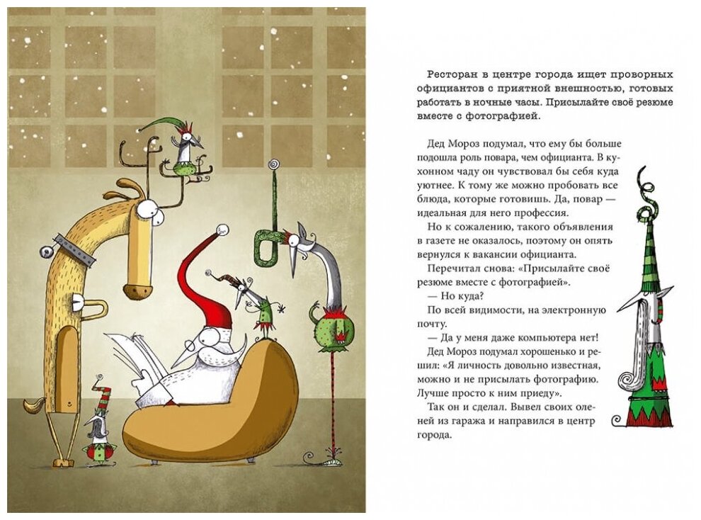 К счастью, Дед Мороз не из тех, кто долго печалится. Он готов засучить рукава и даже сбрить бороду (стоп, это уже слишком!), чтобы найти себе новую работу по душе. Стать официантом? Аниматором? Сборщиком мусора? Дед Мороз со всем справится, а еще придумает, как доставлять подарки, и найдет то, чего даже не искал.