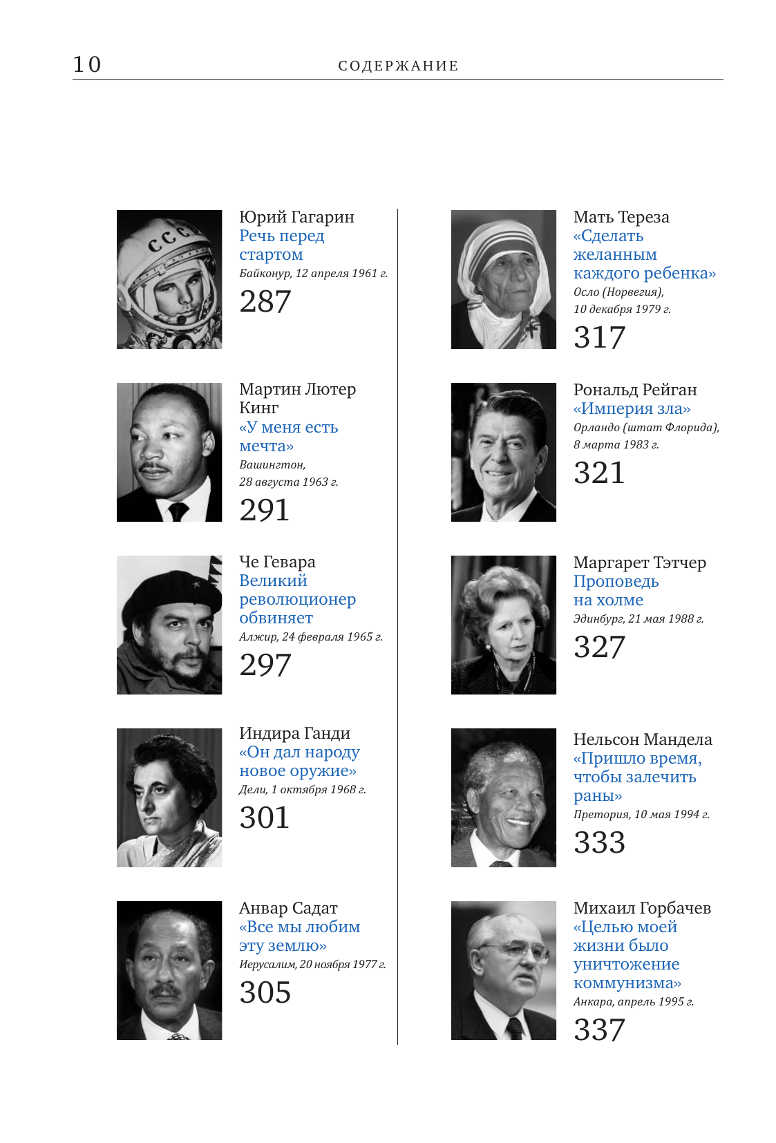 Это подарочное издание представляет бессмертные слова Сократа, Достоевского, Черчилля, Гагарина и многих других, включая наших современников, например, Барака Обамы и Ангелы Меркель. Эти люди меняли мир своими выступлениями, создавали новые страны, религии, целые философские школы.