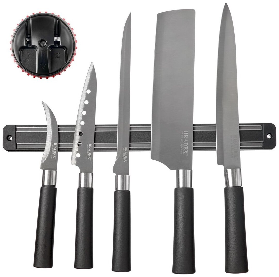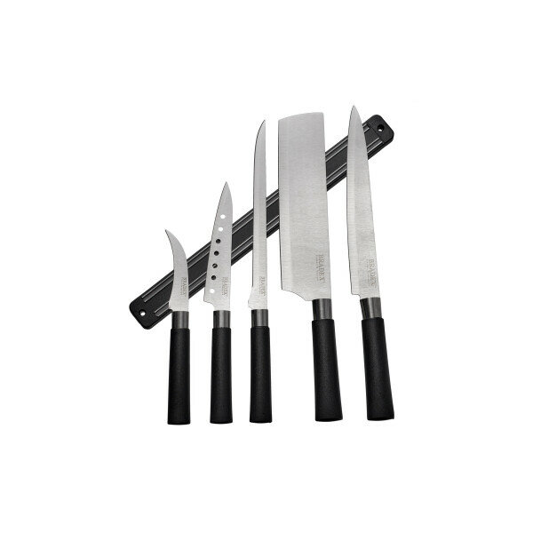 Набор ножей облегчит все процессы нарезки, шинковки, чистки, увеличит скорость и улучшит качество подачи ваших блюд. Легкие, очень острые ножи подобраны по функциональности, каждый из них служит для определенных задач. Магнитный держатель позволяет закрепить ножи на стене. Ножеточка в комплекте.