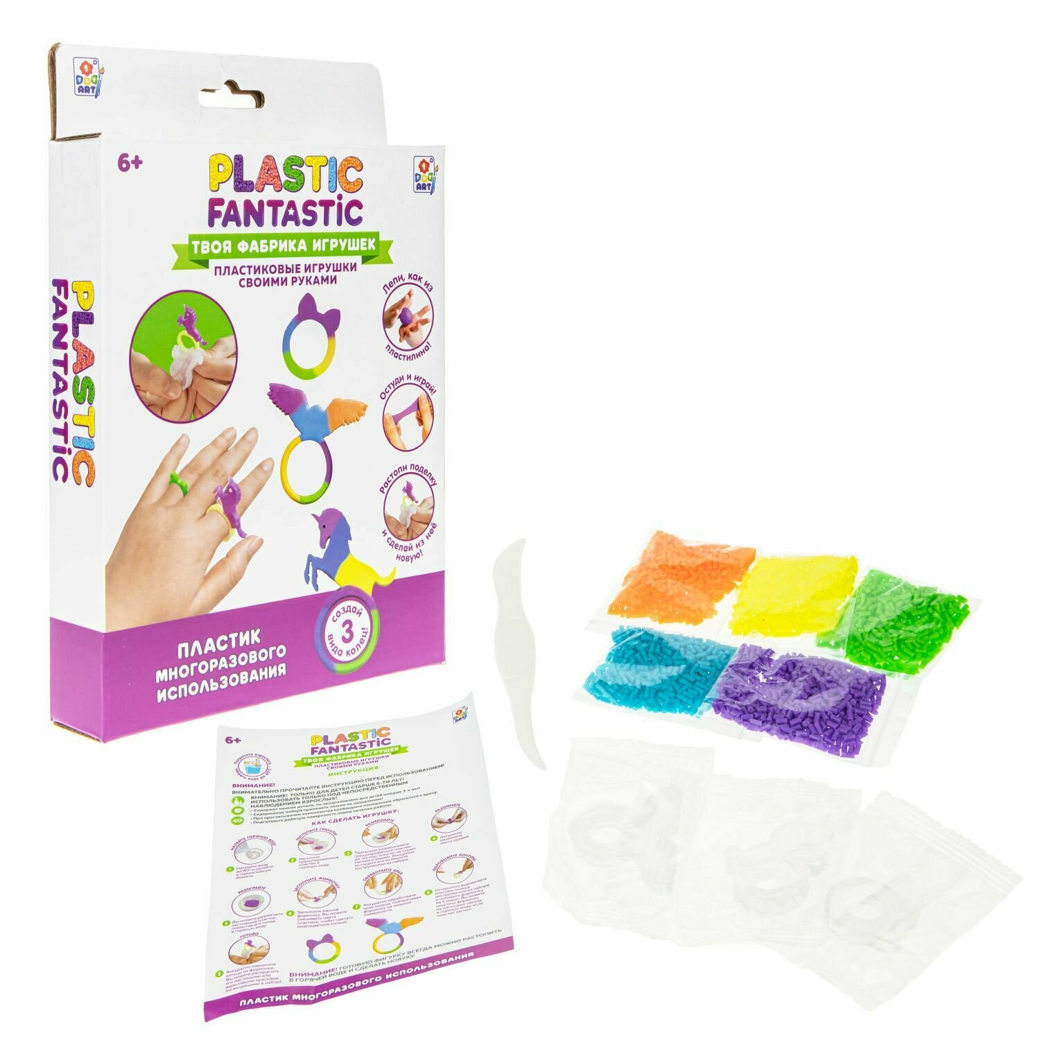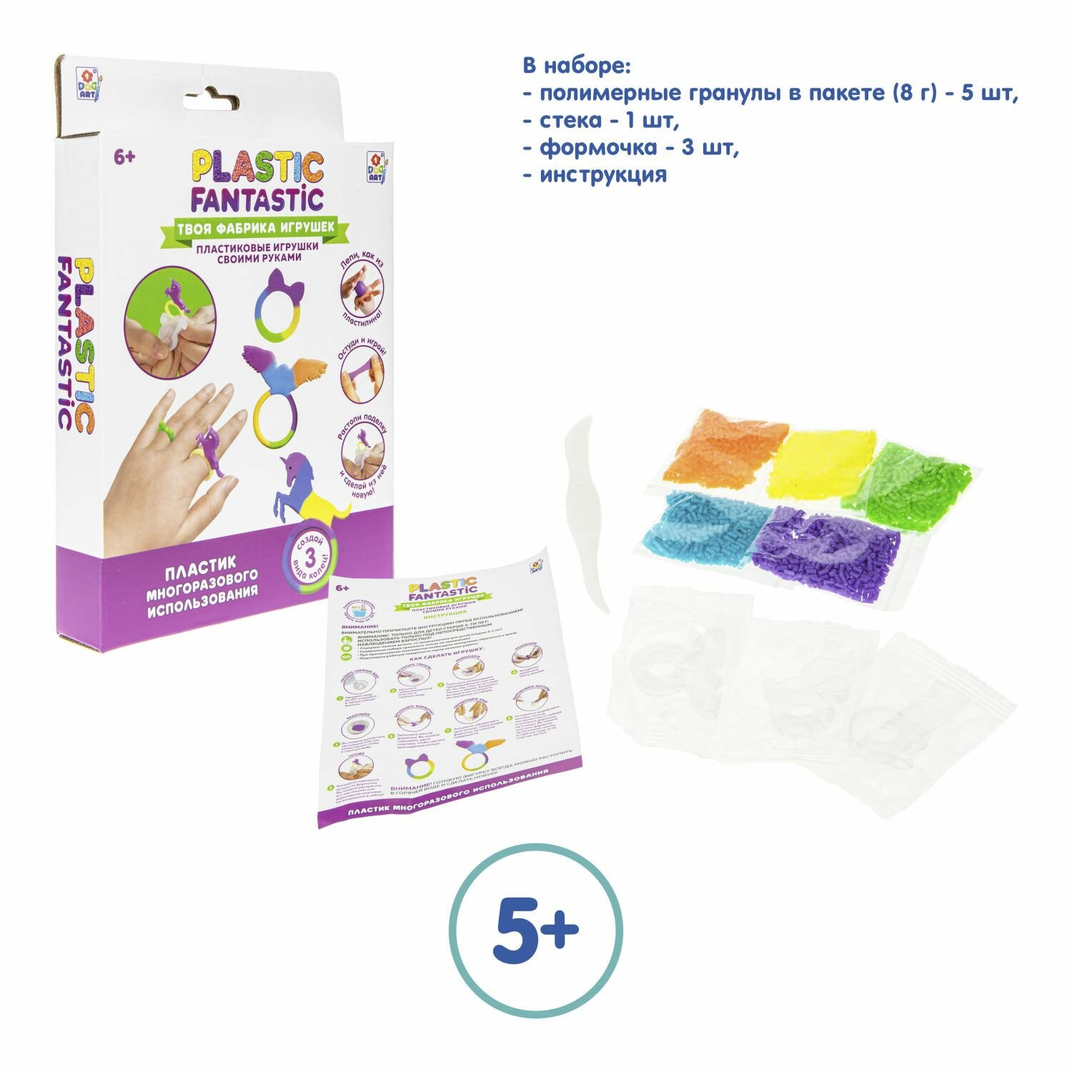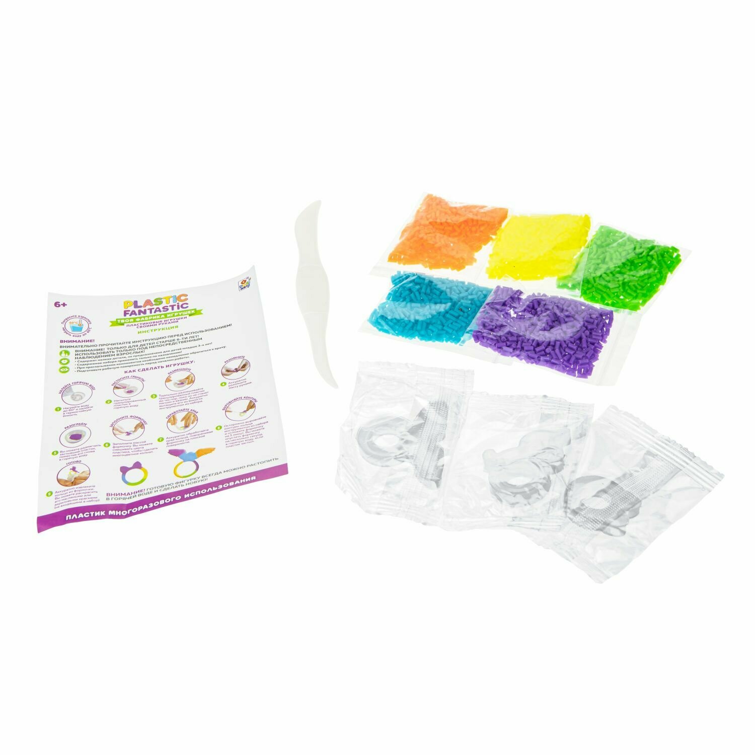 В наборе: гранулированный пластик (5 цветов по 8 гр), стека, 3 формочки, инструкция.