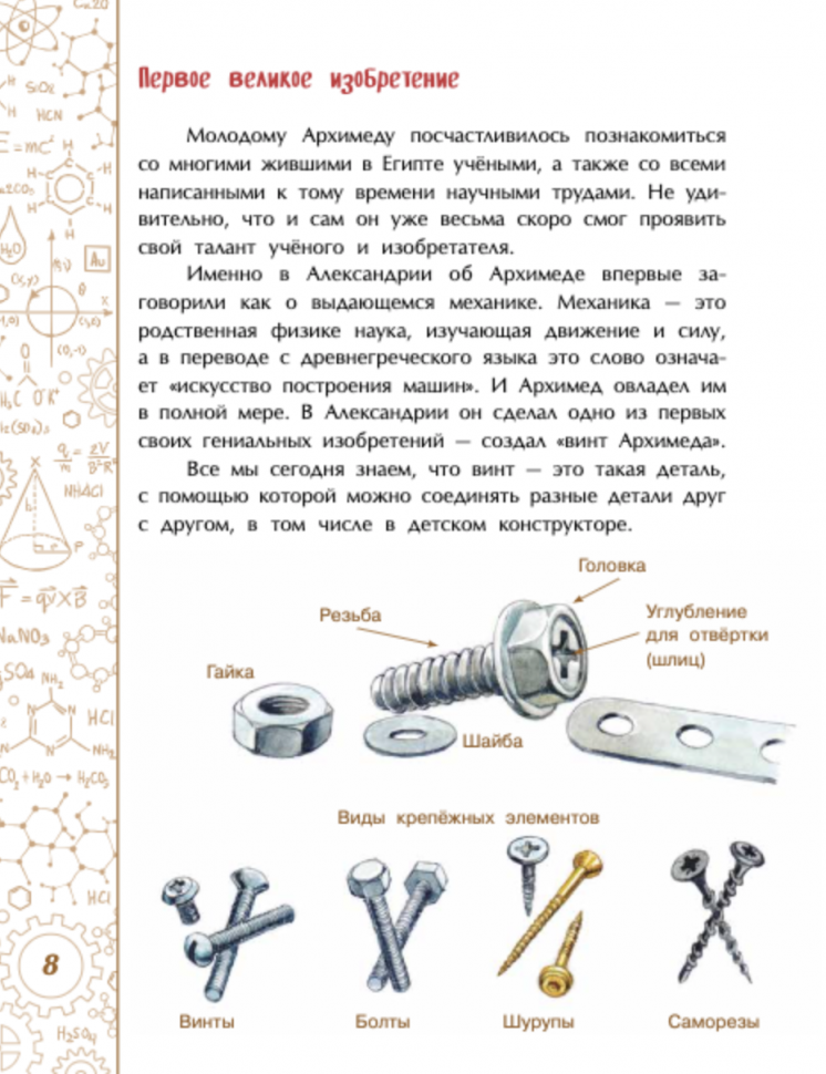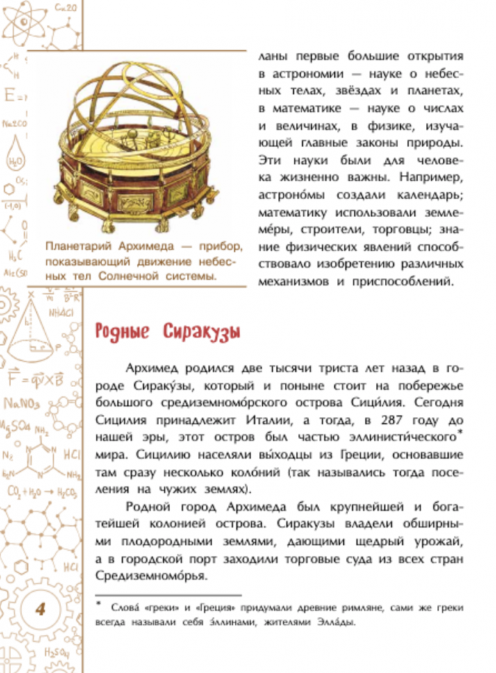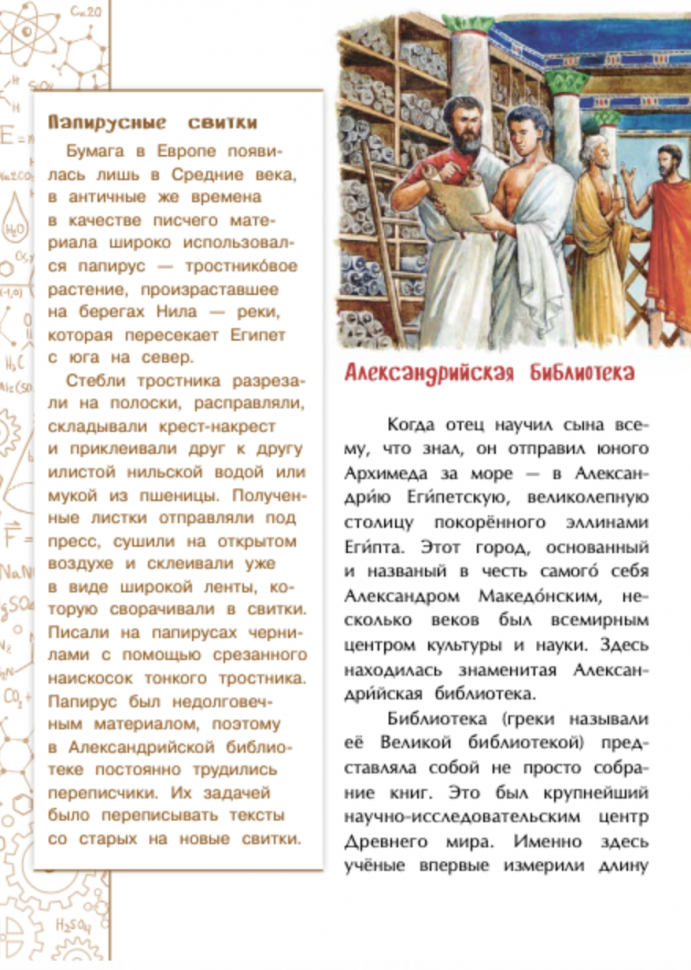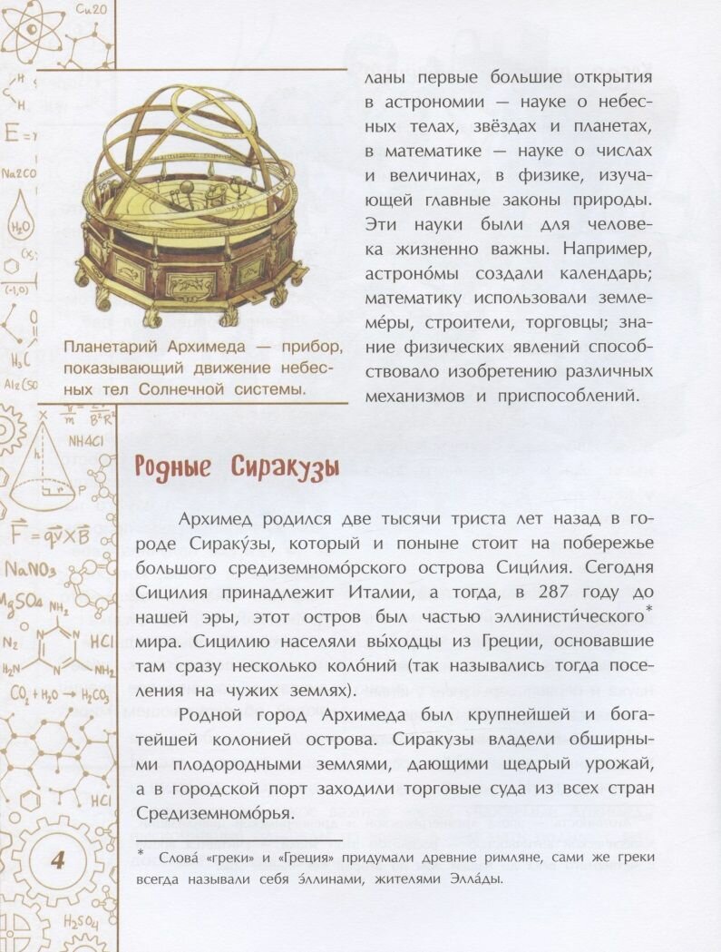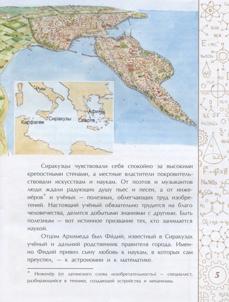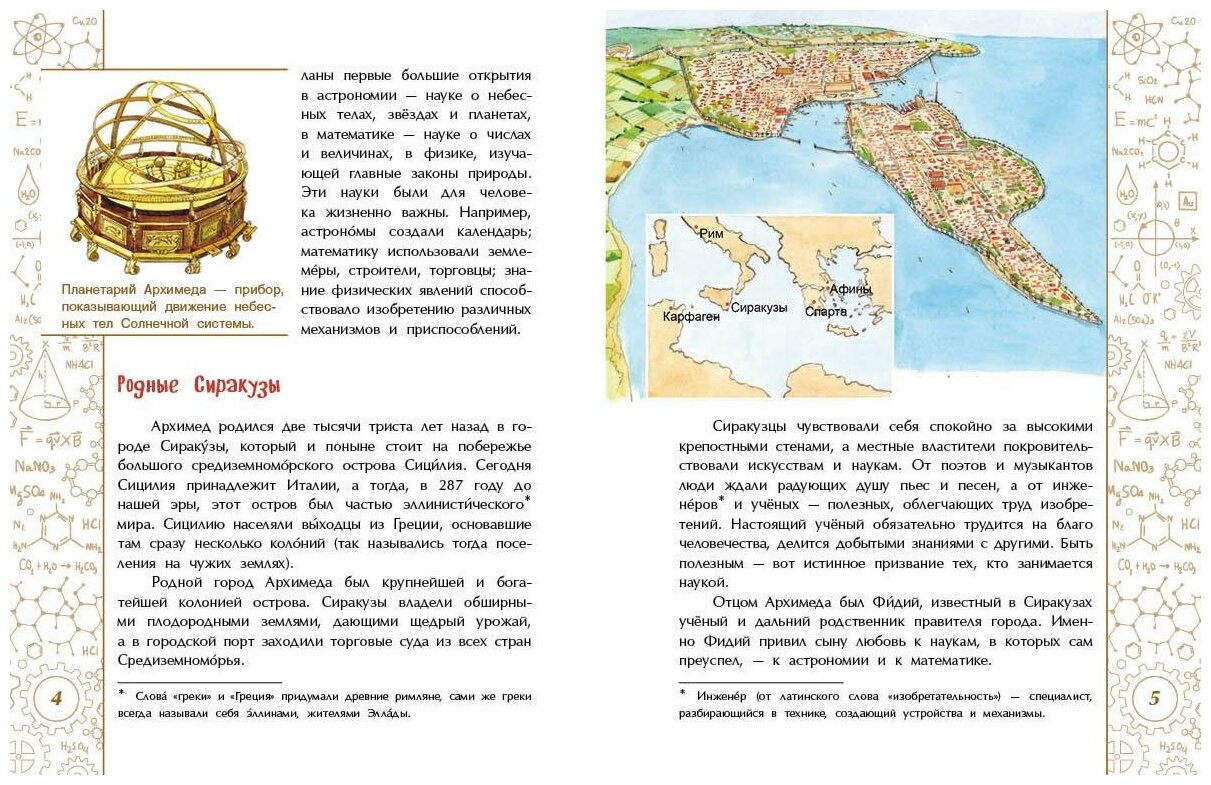 Интересная книга про Архимеда, которая увлекательно, но в то же время коротко и на доступном для юных читателей языке рассказывает о той исторической эпохе, в которой жил Архимед, о его жизни, и его изобретениях (винт Архимеда, рычаг, сила Архимеда, число пи, катапульта, и тд.).