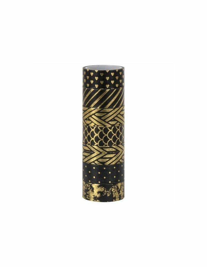 В наборе содержится 7 бумажных лент черного цвета с различными рисунками из золотистой фольги, каждая из которых намотана на пластиковую втулку. Ширина ленты 15 мм позволяет наклеить её даже на небольшие поделки, а длина 3 м даёт большой простор для творчества.
