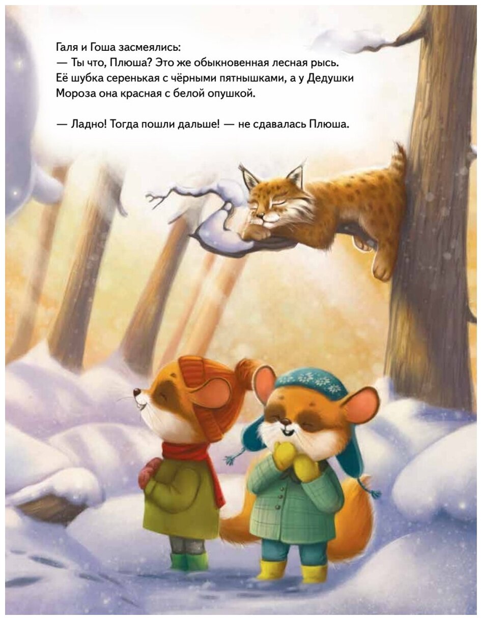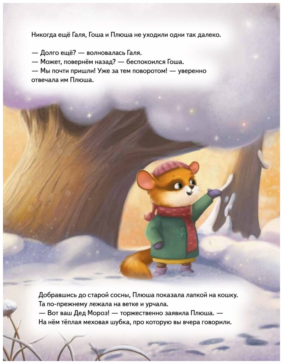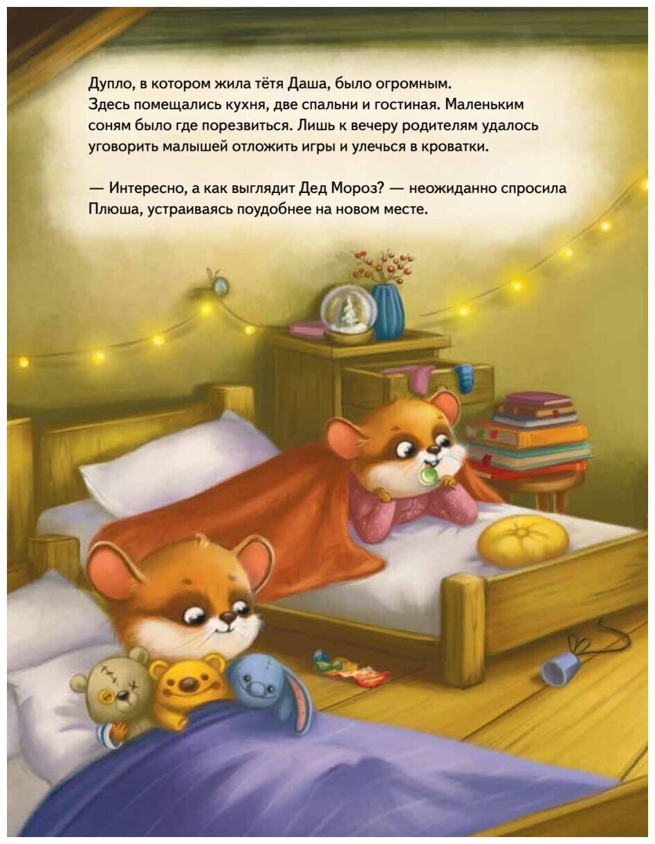 Плюша - маленький зверек соня. Вместе с мамой и папой она живет в дупле старого дуба. Ей очень нравится ходить в Лесную школу, печь пироги и собирать ягоды. А еще, как и все дети на свете, Плюша обожает приключения! Накануне Нового года тетя Даша приглашает малышку с семьёй к себе в гости. Ура! Плюша отправляется в настоящее новогоднее путешествие по зимнему лесу, где она встречает загадочных зверей и... неужели самого Деда Мороза? Поскорее открывай книгу - давай узнаем, что случилось с Плюшей и ее братиком и сестричкой накануне Нового года! Книга предназначена для чтения взрослыми детям.
