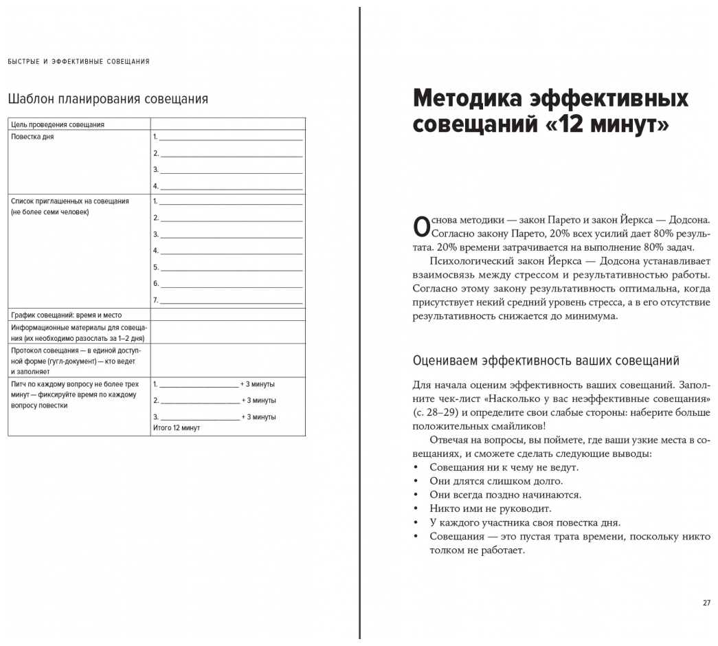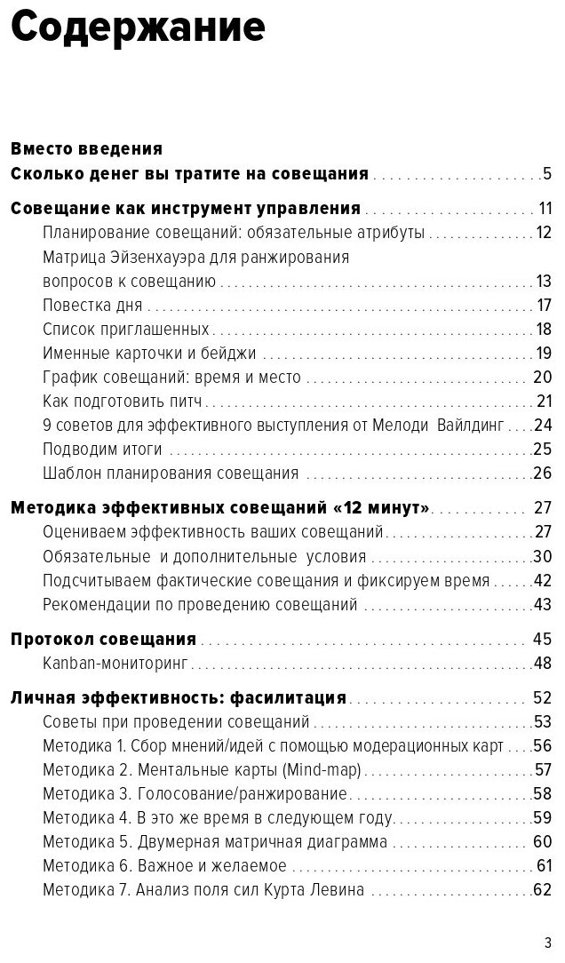 Ольга предлагает к изучению 16 методик и 4 инструмента для организации групповых обсуждений и повышения личной эффективности ответственных лиц. Кроме того, подробно описана авторская методика совещаний «12 минут», приведены рекомендации по подготовке к совещаниям, описаны 8 техник модерации и дана таблица для оценки результативности по итогам проведения.