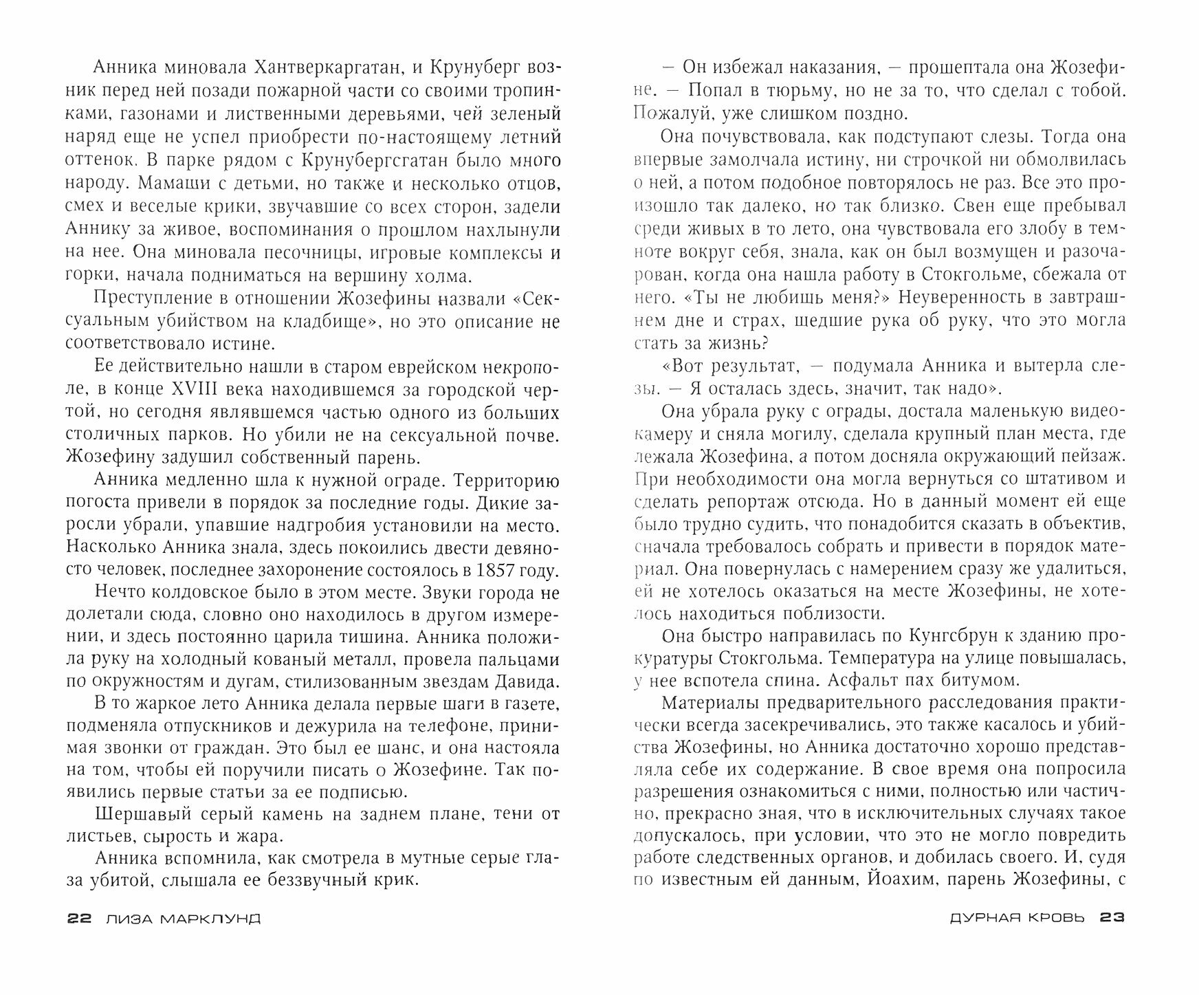 Интересный скандинавский детектив , одиннадцатая книга серии про журналиста газеты \" Квельспрессен \" Аннику Бенгтзон , в какой-то степени продолжение начавшейся в предыдущей книге истории о братьях-убийцах. Сюжет сложный , речь идёт сразу о нескольких преступлениях , в том числе произошедших в прошлом или в других книгах. В книге удивительно большое количество персонажей , поэтому много внимания уделяется их личным взаимоотношениям. У самой Анники много изменений в служебных обязанностях , закрыта бумажная версия газеты , где она проработала много лет , что и приводит к этим изменениям.