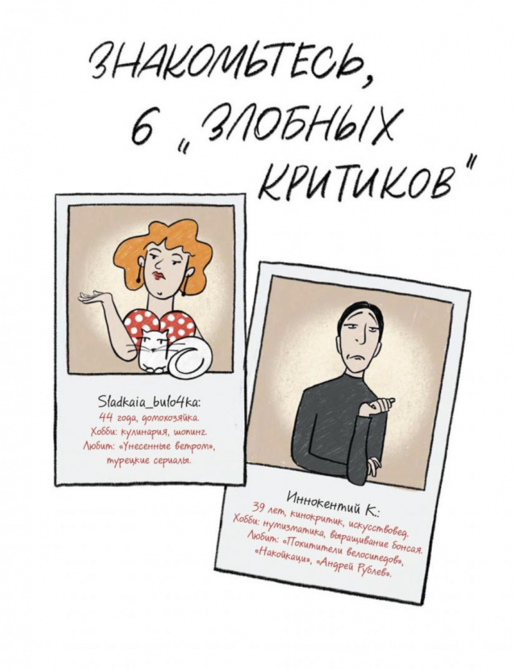 А чтобы вам всегда было с кем обсудить увиденное, в книге вы познакомитесь с шестью «злобными кинокритиками». Каждый из этих персонажей — от домохозяйки до феминистки — имеет свой взгляд на разные киноленты, с которым вы сможете согласиться или нет.