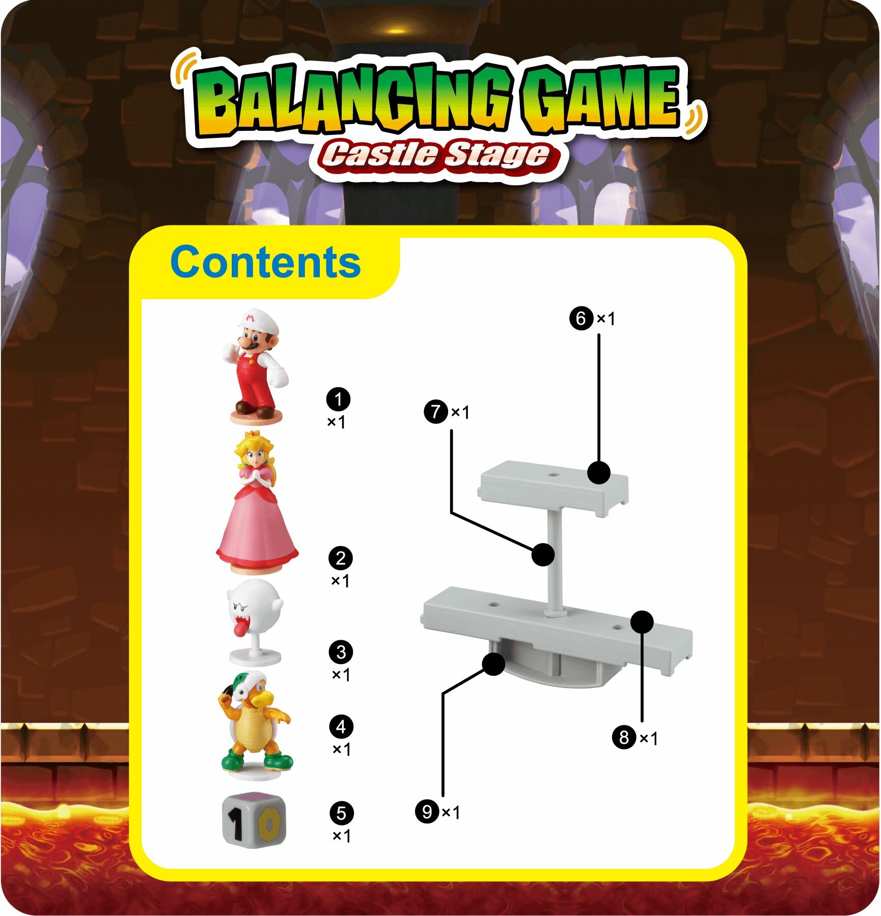 Подготовьтесь к удивительным приключениям вместе с набором Супер Марио "Платформы "Уровень в замке". Кидайте кубик и перемещайте фигурки на платформу уровня, тот игрок у которого падает фигурка - проигрывает. Комбинируйте платформы из других наборов Супер Марио "Платформы" и сделайте игру еще интереснее. Играть с любимыми героями смогут и игроки без опыта: нужно только немного воображения, хорошего настроения и фантазии. Игра не закончится очень долго: вы всегда сможете начать сначала.
