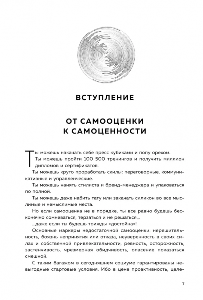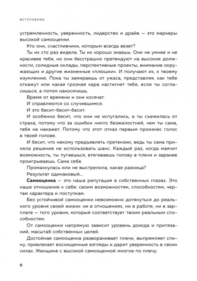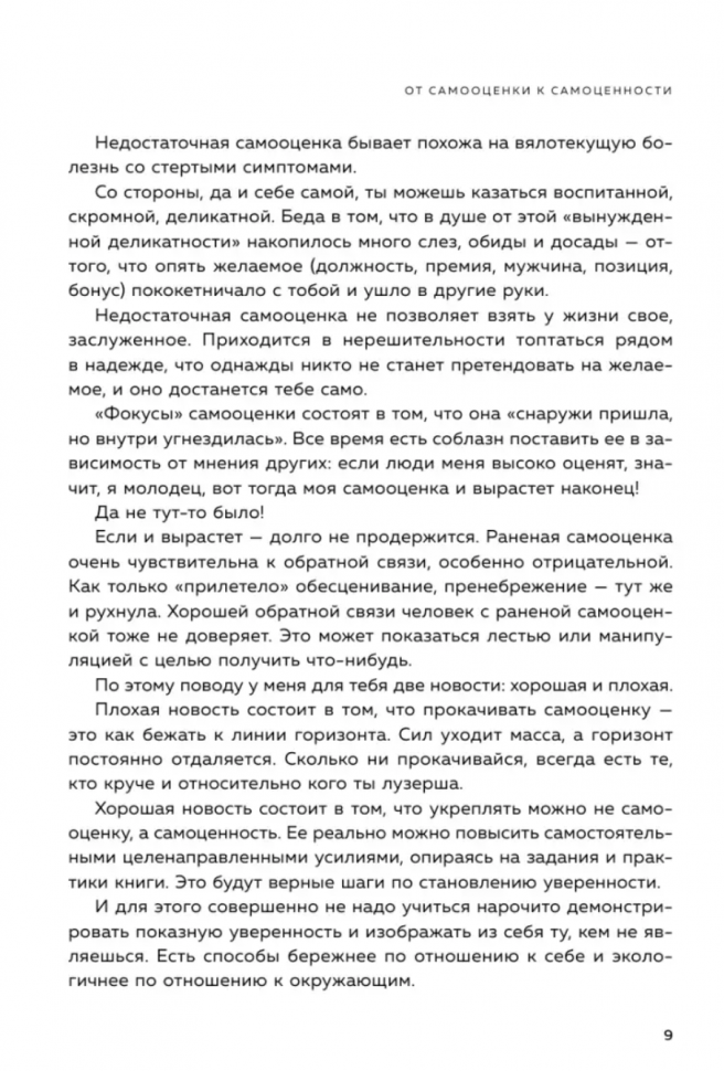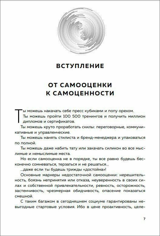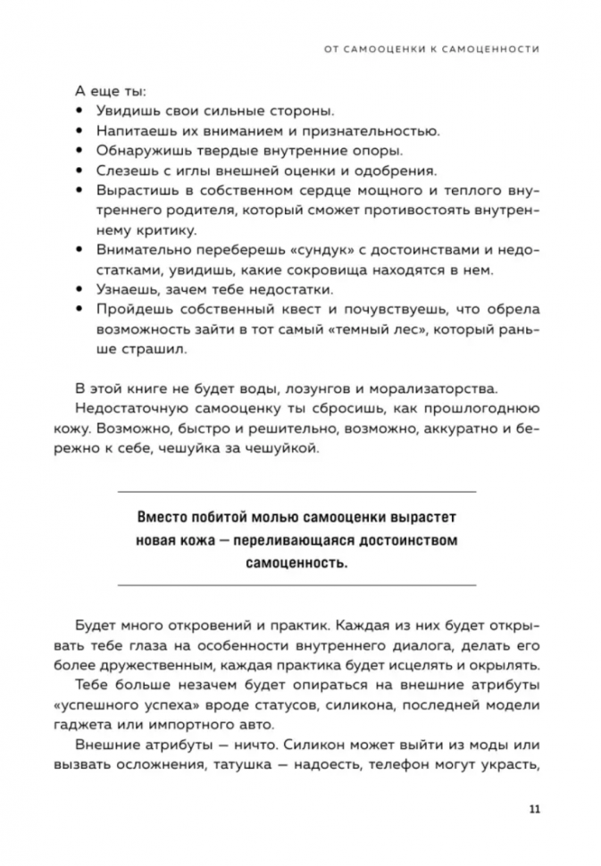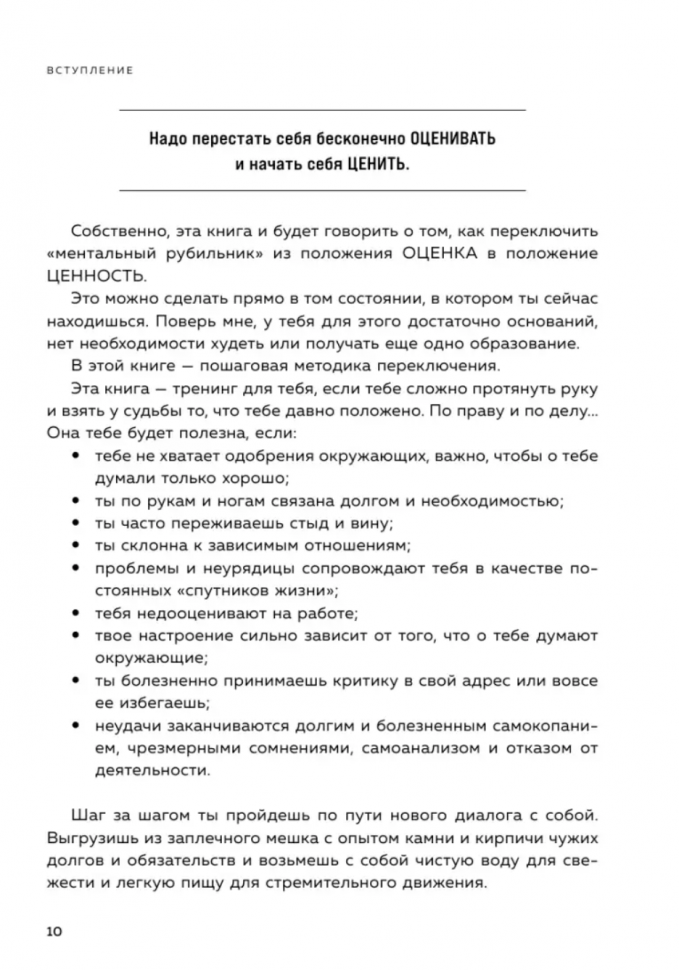 Мне очень понравилось, я зачиталась и забыла обо всем. Всегда веря в то, что самооценка важнее всего, я правда забыла о самоценности, о которой и говорит автор - Елена Рисберг. Эти две вещи, самооценка и самоценность, очень важны и прокачивать надо два этих фактора. Мне нравится, что Елена рассказывала и о своей жизни, показывала примеры, очень много примеров разных ситуаций и разбирала их досконально.