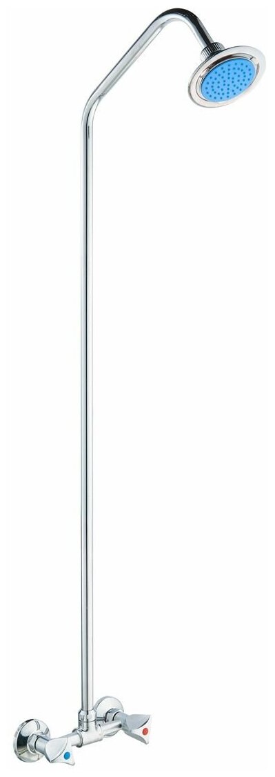 Двухвентильный смеситель с высокой душевой стойкой, верхним душем.При производстве смесителей ТМ РМС используются только высококачественные материалы. Все модели проходят процесс гальванизации, что придает им большую износостойкость и улучшает антикоррозийные свойства. Хромированная поверхность не потеряет со временем свой роскошный вид, а уход за ней сводится к протиранию мягкой салфеткой. Установка смесителя крайне проста.Смесители РМС это сертифицированный продукт с 5-летней гарантией.Смеситель для душа с лейкойКран-букса латунная с керамическими пластинами угол поворота 180 градусовЦвет покрытия корпуса: хромВ комплекте: верхняя лейка, металлическая стойка, эксцентрики, отражатели