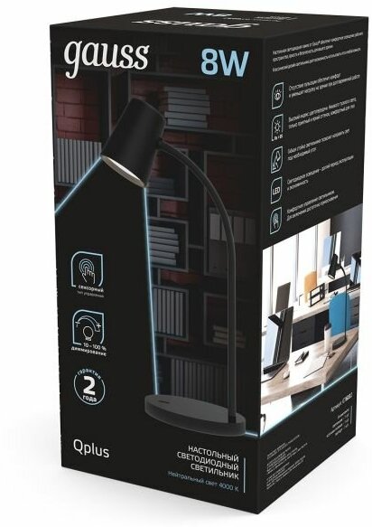 Офисная настольная лампа светодиодная с выключателем и регулировкой яркости Qplus - продукт известной компании Gauss (Россия). Имеет максимальную мощность 8 Вт, освещает площадь до 1.6 кв. м. Отлично подойдет для таких мест, как кабинет, офис. Впишется в интерьеры следующих стилей: хай-тек, техно.