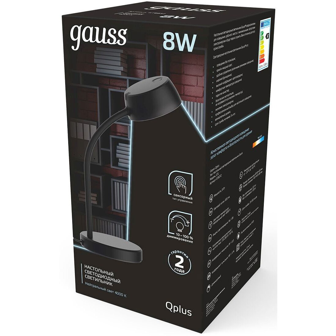 Офисная настольная лампа светодиодная с выключателем и регулировкой яркости Qplus - продукт известной компании Gauss (Россия). Имеет максимальную мощность 8 Вт, освещает площадь до 1.6 кв. м. Отлично подойдет для таких мест, как кабинет, офис. Впишется в интерьеры следующих стилей: хай-тек, техно.
