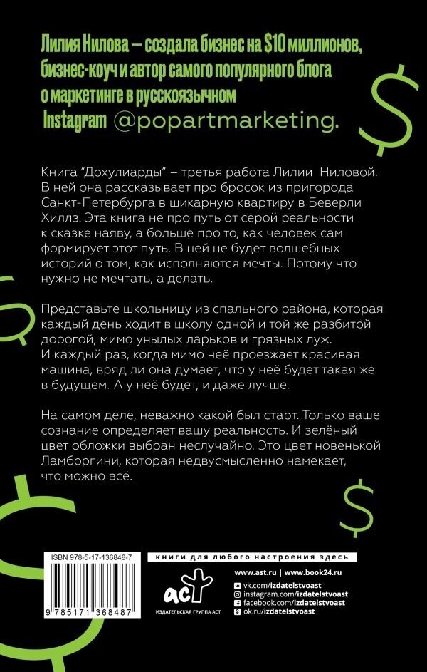 Книга "Дохулиарды" уже третья работа Лилии Ниловой. В ней она рассказывает про бросок из пригорода Санкт-Петербурга в шикарную квартиру в Беверли Хиллз. Эта книга не про путь от серой реальности к сказке наяву, а больше про то, как человек сам формирует этот путь. В ней не будет волшебных историй о том, как исполняются мечты. Потому что нужно не мечтать, а делать. Представьте школьницу из спального района, которая каждый день ходит в школу одной и той же разбитой дорогой, мимо унылых ларьков и грязных луж. И каждый раз, когда мимо неё проезжает красивая машина, вряд ли она думает, что у неё будет такая же в будущем. А у неё будет, и даже лучше.