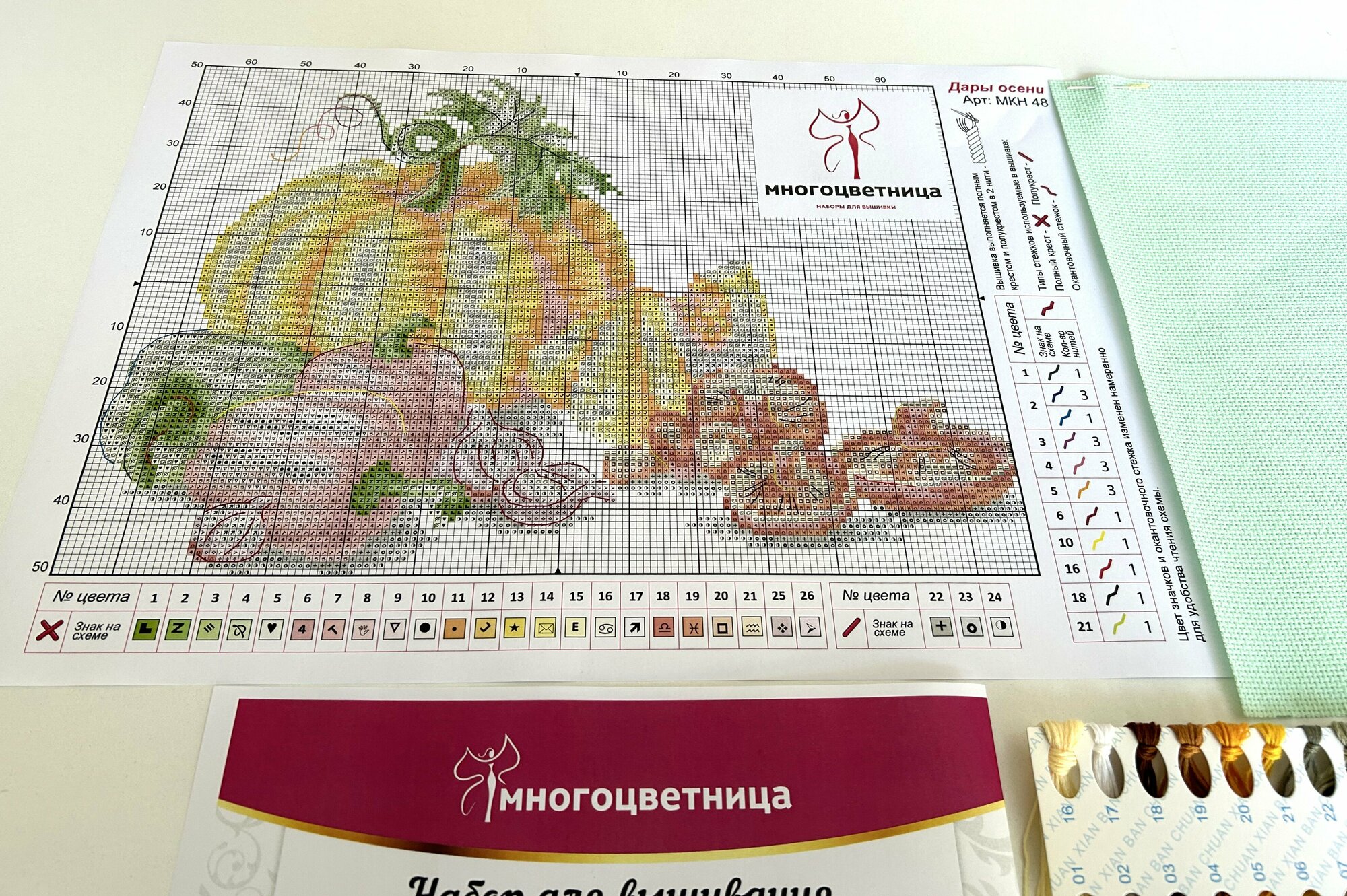| В набор входит | канва Aida 14 салатовая, мулине СХС (аналог DMC) п/эст. на органайзере, игла, цветная схема на бумаге, инструкция по вышивке |