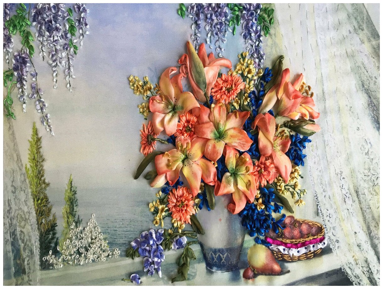| В набор входит | Ткань с нанеченным рисунком (габардин), ленты атласные разных размеров (100% полиэстер) на органайзере, мулине х/б на органайзере, бисер, иголка, цветная символьная схема на бумаге, 2 инструкции (подробная по вышивке набора и подробная по стежкам) |