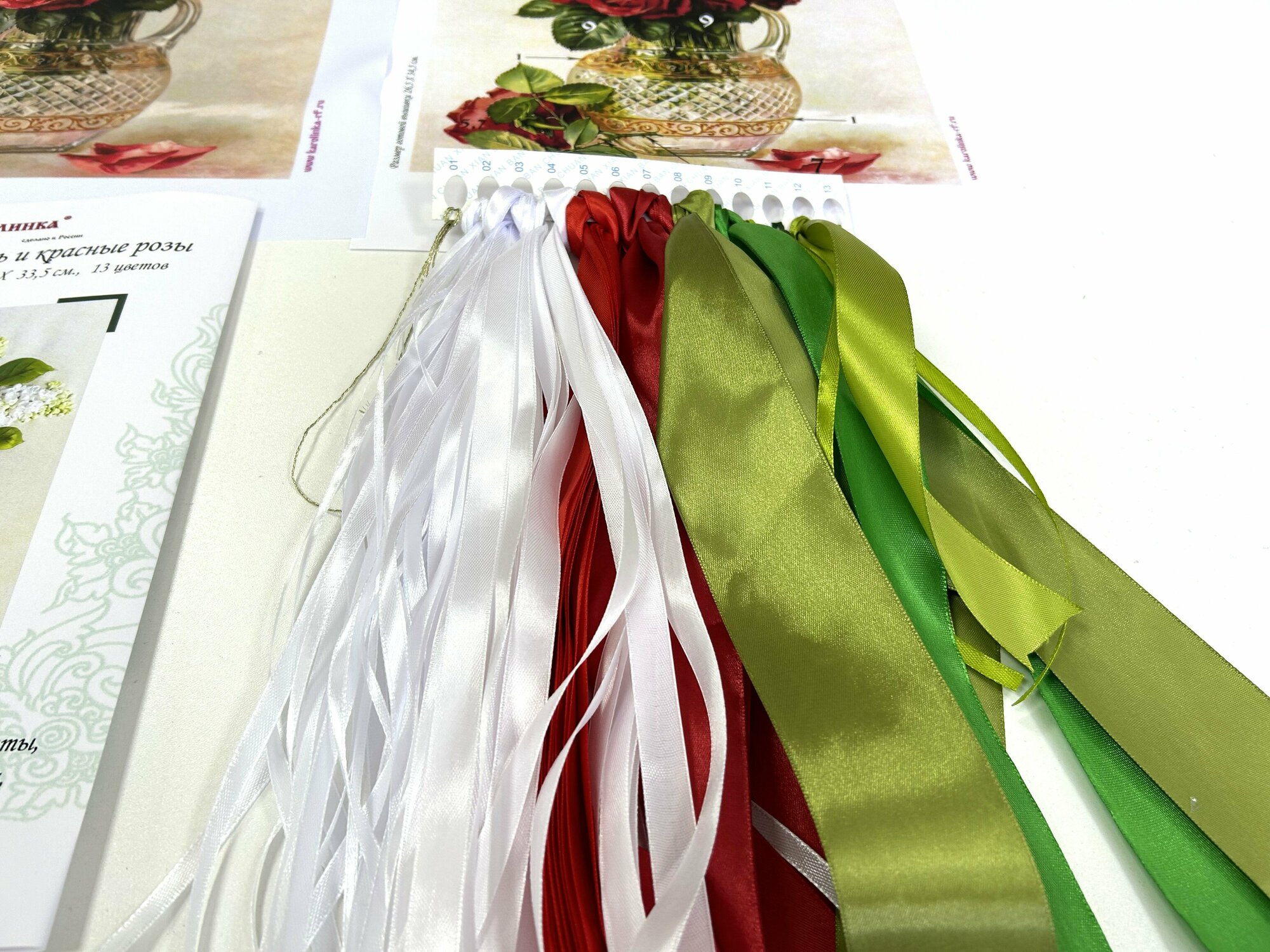 | В набор входит | Ткань с нанеченным рисунком (габардин), ленты атласные разных размеров (100% полиэстер) на органайзере, мулине х/б на органайзере, бисер, иголка, цветная символьная схема на бумаге, 2 инструкции (подробная по вышивке набора и подробная по стежкам) |