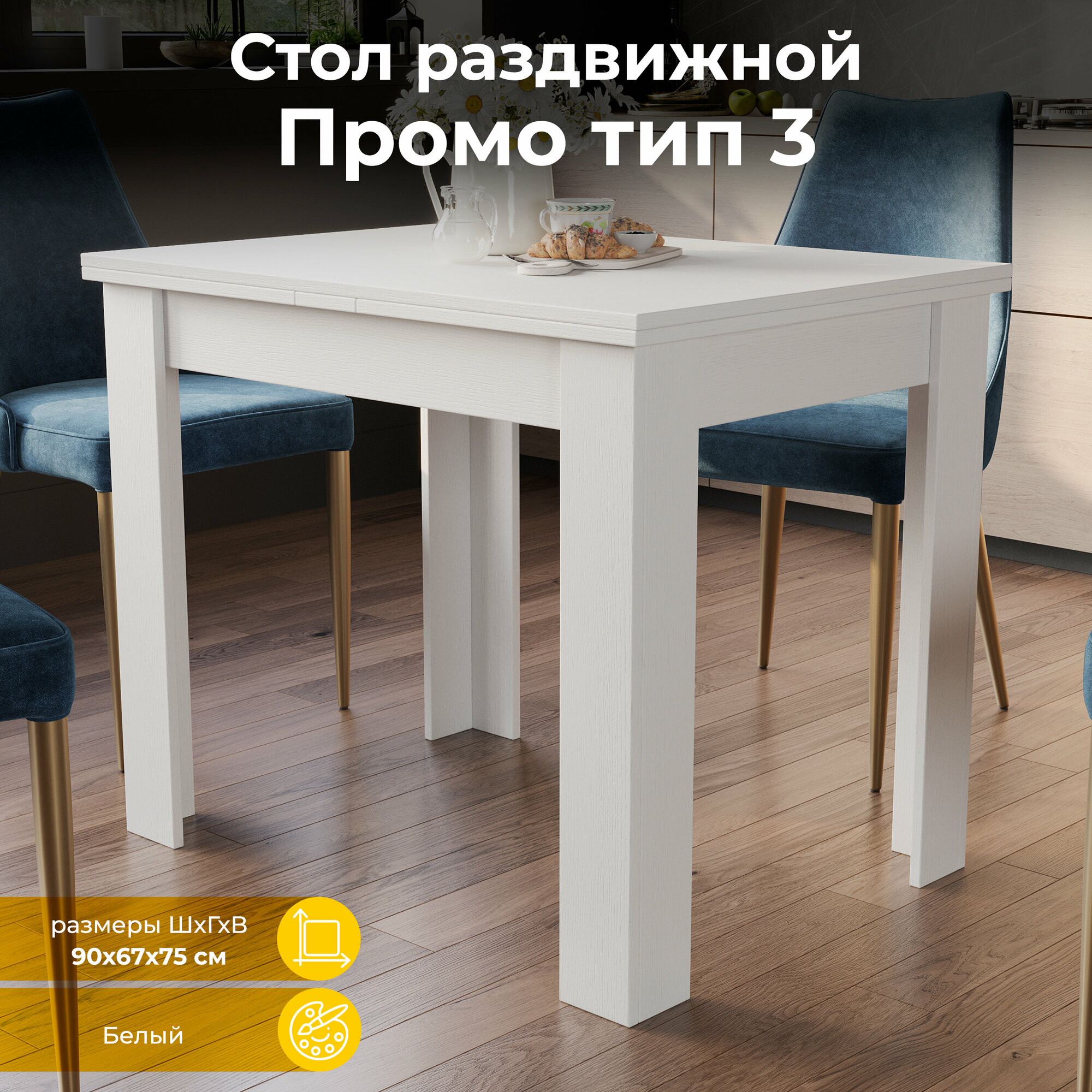 Раздвижной стол Промо — отличный выбор для тех, кто вынужден экономить место в квартире или просто не любит загромождать пространство крупной мебелью. Модель сочетает в себе элегантность, лаконичность и функциональность. Четкие прямые линии, приятная неброская расцветка, простой и надежный механизм трансформации — все это делает стол Промо практичным приобретением на каждый день и для званых ужинов. Широкие опоры и прямоугольная столешница выполнены из ЛДСП с ПВХ-кромкой. Материал эстетичен, не требователен в уходе, устойчив к влаге и загрязнениям. Изделие будет прекрасно смотреться в любом современном интерьере.