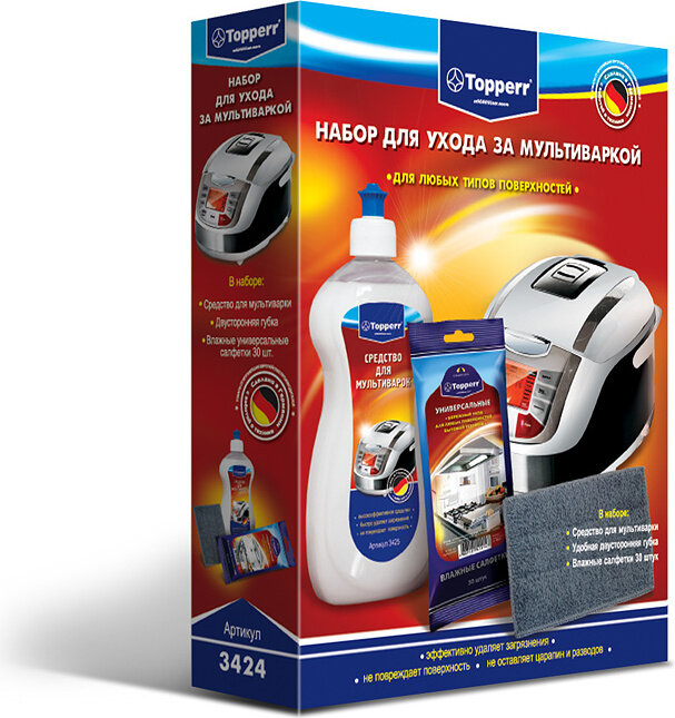 Набор "Topperr" предназначен для эффективной очистки мультиварок. Используя этот набор, вы сможете продлить срок службы вашей мультиварки и сохранить ее первоначальный внешний вид. В набор входит: - средство для мультиварки. Предназначено для быстрого удаления жира и загрязнений с керамических и тефлоновых поверхностей. Средство обладает антибактериальными свойствами, препятствует образованию бактерий и микроорганизмов. Легко растворяет жир и загрязнения, устраняет запахи. - эргономичная двусторонняя губка.
