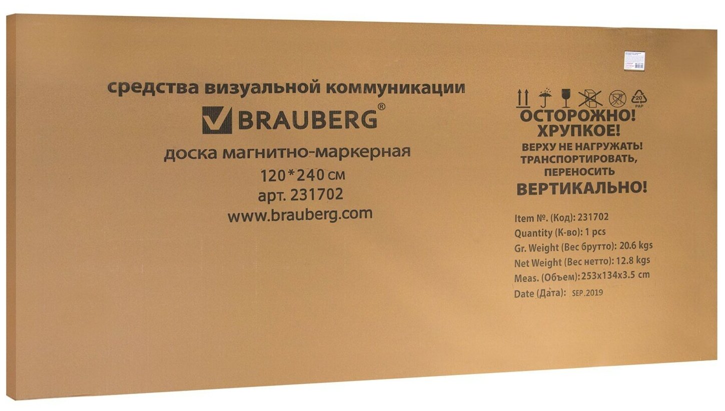 Лаковое покрытие предназначено для письма специальными маркерами для белой доски, а металлическая поверхность позволяет размещать информацию при помощи магнитов. Доска размером 120х240 см имеет укрепленные пластиковые уголки, которые позволяют скрыть места крепления к стене. Профиль придает изделию дополнительную прочность и современный стильный внешний вид. Элементы крепления входят в комплект. Для защиты рабочей поверхности доски на нее нанесена защитная пленка. Перед началом работы – удалить защитную пленку. При должном уходе за рабочей поверхностью доски при помощи чистящей жидкости-спрея и стирателей BRAUBERG поверхность магнитно-маркерной доски прослужит более 10 лет.