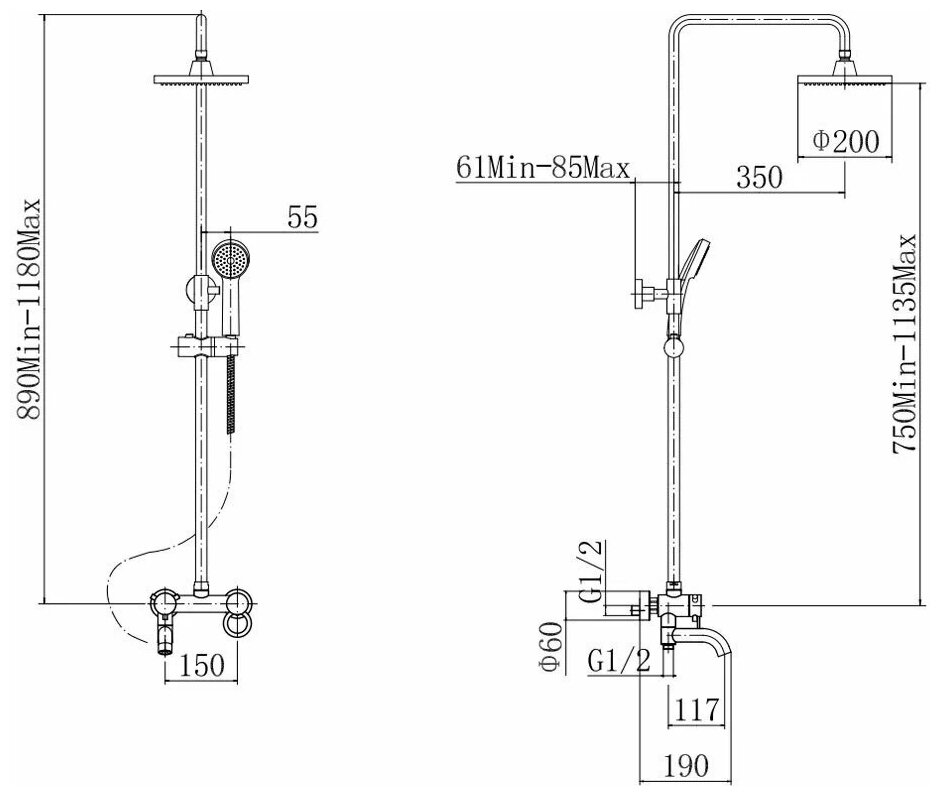 | Габариты верхнего душа | 200 |
