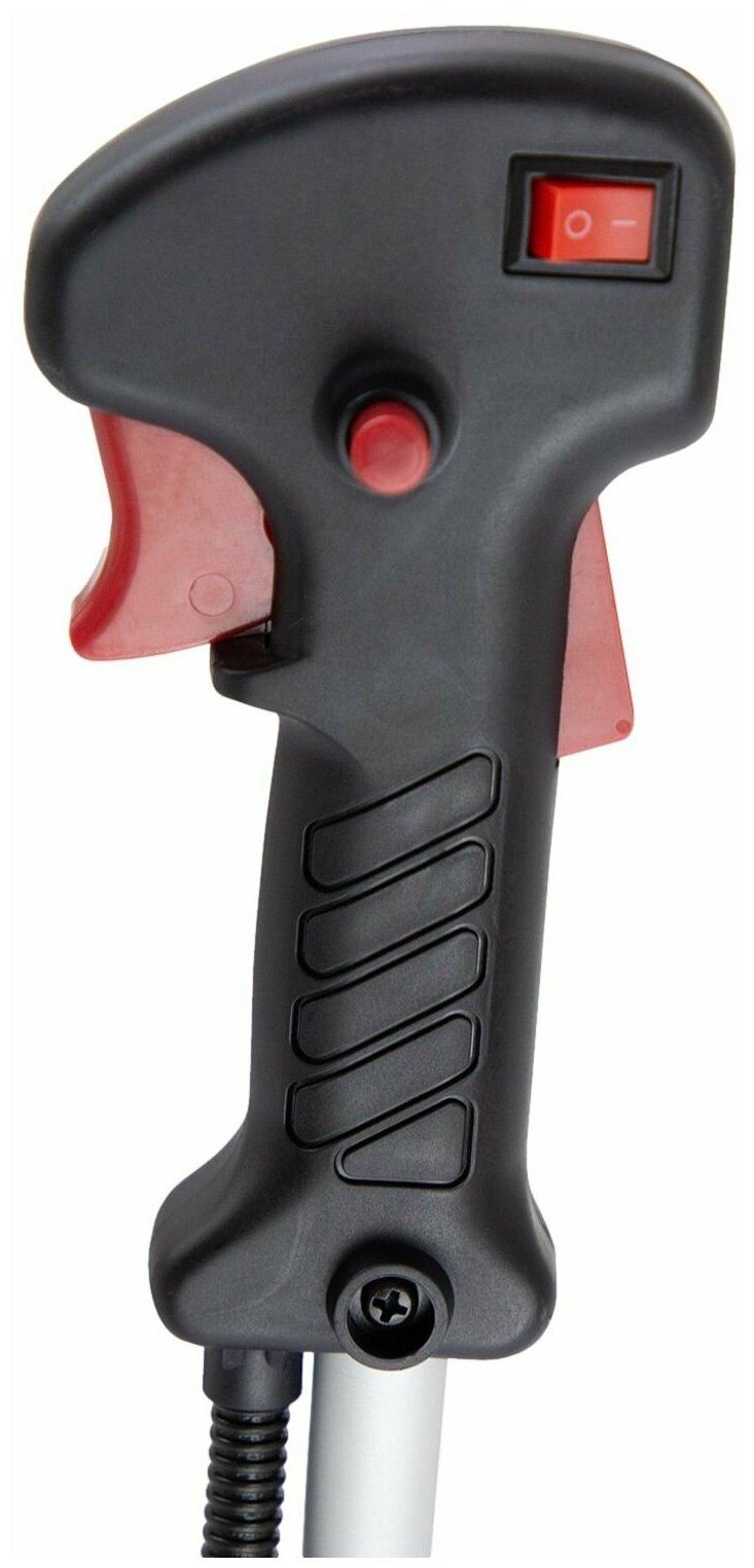- Кнопка на триммерной катушке позволяет увеличить длину лески, не снижая оборотов двигателя. Достаточно лишь слегка ударить ею о землю. Защитный кожух предотвращает отскакивание веток и камней на оператора.