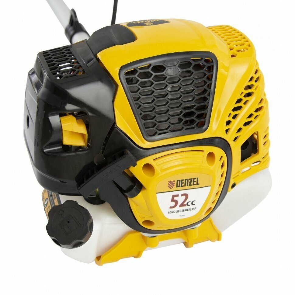 | Прочие особенности и свойства | Бензиновый триммер Denzel DTL-52 с увеличенным до 52 см3 объемом двигателя отличается самыми высокими параметрами работы из линейки DTL. Он пригодится как для частичного подравнивания травы на участке, так и подрезания молодых кустарников и побегов деревьев. Два режущих инструмента — леска и пильный диск — работают на скорости 9500 об/мин и обеспечивают ширину скашивания 25,5 см и 42 см соответственно.,,Мощный двигатель 3 л.с. потребляет топливо экономично, поэтому часто заправлять бак не придется. Благодаря беспроводной работе бензотриммер подойдет для применения в любом уголке участка, даже самом отдаленном.,,Высокий ресурс поршневой группы обеспечивается качественными деталями:цилиндр двигателя покрыт пористым хромом и хонингован.,Удобный дозатор для смешивания топливной смеси прилагается к триммеру.,Стенки бензобака сделаны прозрачными для удобного контроля уровня топлива. А значит не возникнет непредвиденной остановки работы.,Блокировка газа на рукоятке не допускает случайный запуск двигателя, что защищает оператора от травм.,Система полуавтоматической подачи лески позволяет увеличить ее длину легким ударом шпули о землю. При этом работу двигателя останавливать не придется.,В случае, если длина лески превышает допустимую, ограничительный нож на кожухе триммера подрезает ее. Таким образом предотвращается лишняя нагрузка на двигатель и его перегрев.,Защитный кожух закрывает режущую часть, поэтому на оператора не отлетят ветки и камни.Замена оснастки производится в считанные секунды, что значительно упрощает и ускоряет рабочий процесс.,Эргономичная рукоятка асимметричной формы обеспечивает комфортный хват и не ограничивает оператора в движениях.,Триммер идеально отбалансирован, поэтому его не клонит в стороны даже при сложном маневрировании.,Плечевой ремень с защитой бедра обеспечивает снятие нагрузки с рук и защиту ноги от возникновения синяков.,Антивибрационная система из нескольких амортизаторов снижает воздействие вибраций на организм оператора и сохраняет суставы здоровыми.,Вес триммера составляет всего 7.6 кг, как у моделей с меньшей мощностью. Поэтому работать с ним и перемещать не составляет труда. |