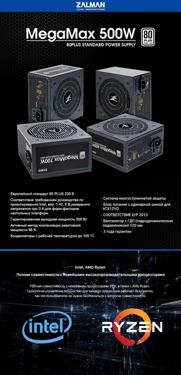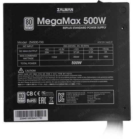 Блок питания ATX Zalman ZM500-TXII (V2) 80PLUS STANDARD Active PFC 120mm fan Retail MegaMax 500W v2