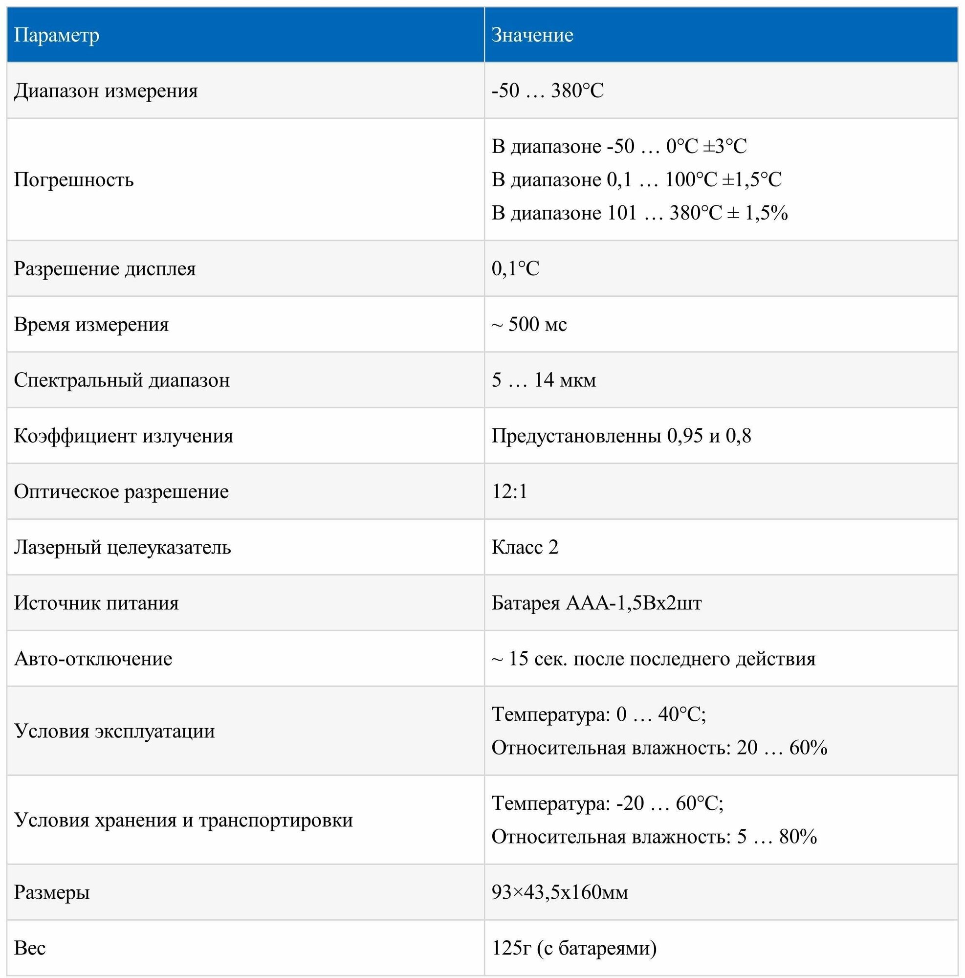 | Мин. измеряемая температура, °С | -50 |