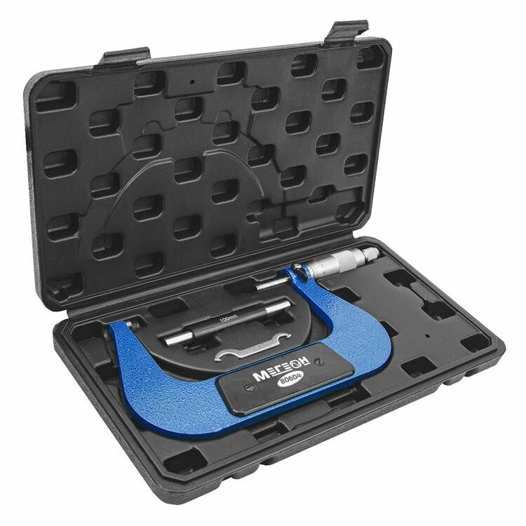 Мегеон – классический микрометр высокой точности измерения. Представленная модель позволяет проводить замеры деталей в диапазоне 100 125 мм с погрешностью не более 0,01 миллиметра. Для точной установки нуля в комплекте поставки предусмотрена установочная мера. Измерительные поверхности имеют твердосплавные напайки, что в свою очередь является признаком качества инструмента. Скоба обработана молотковой краской с высокими показателями сопротивления к сколам и царапинам. Дополнительно в местах касания пальцев установлена теплоизоляционная накладка с внешней и тыльной сторон. Для изготовления всех элементов конструкции была применена качественная инструментальная сталь. Проскальзывание пальцев исключается благодаря сетчатой накатке, нанесённой на барабан и трещотку. Предотвращение повреждений во время транспортировки и хранения обеспечивается ударопрочным футляром.
