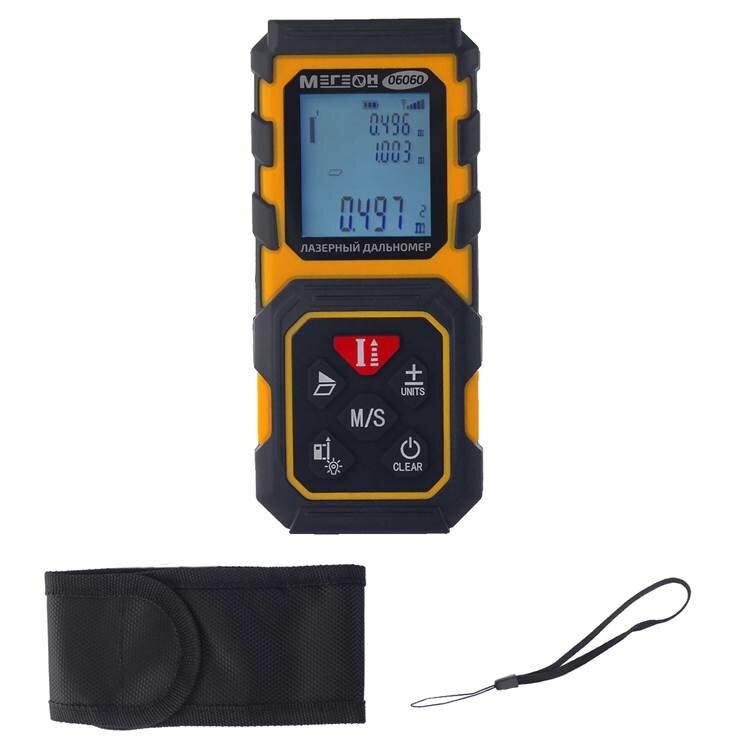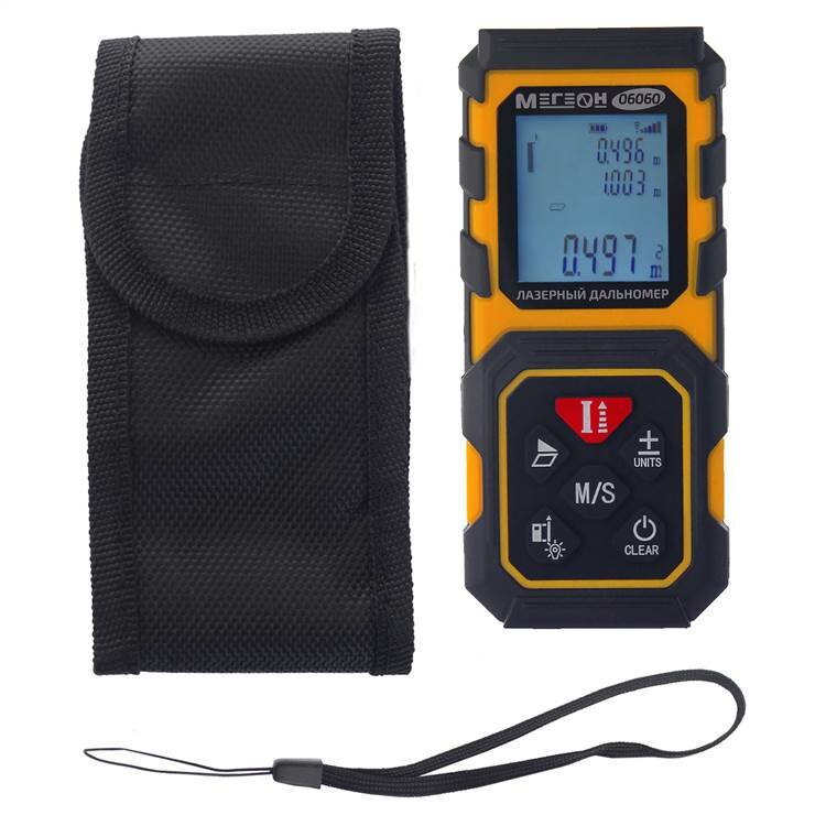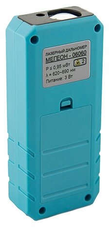 | Комплектация | 1. Лазерный дальномер МЕГЕОН 06060 – 1 шт., 2. Чехол – 1 шт., 3. Ремешок на запястье – 1шт., 4. Батарея 1,5В тип ААА – 2 шт., 5. Руководство по эксплуатации – 1 экз., 6. Гарантийный талон – 1 экз. |